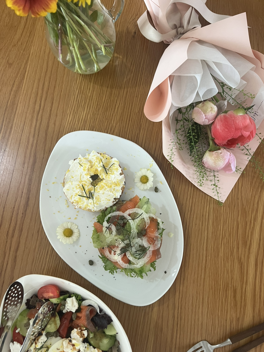 준비한 접시에 베이글 단면이 위로 가게 내려놓았다.