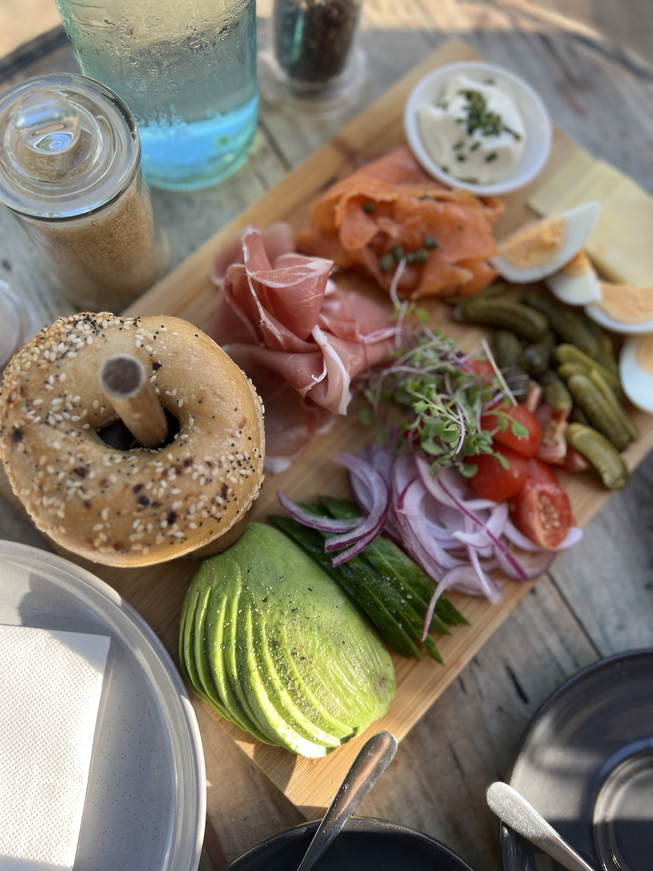 테이블을 가득 메운 우드플레이트 위에 붉고 푸른 것들이 알록달록 향연을 펼치고 있었다. 하나하나 따져보니 베이글 샌드위치에 들어가는 재료들이다. 소금과 후추가 뿌려진 아보카도, 적양파와 오이, 방울토마토, 피클, 새싹채소, 삶은 달걀, 케이퍼가 올려진 훈제연어와 프로슈토햄, 쪽파크림치즈까지 빠짐없이 ‘베이글 샌드위치’ 재료들이었다. 나란히 올려진 샌드위치 재료들이 이토록 확실한 아름다움을 만들어 내다니. 예술작품에 가까운 플레이트였다. 이 메뉴를 개발한 사람은 대체 어떤 사람일까. 이건 한국에 돌아가서도 반드시 따라 해 봐야지.