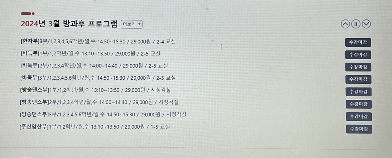 8시가 되자마자 빠르게 희망과목 수강신청 버튼을 눌렀다. 보호자의 이름과 휴대폰 번호는 아까 미리 입력해 둔 덕에 지체 없이 '수강신청 완료' 버튼을 누를 수 있었다. 수강신청은 '1초 컷'이었다. 1초 만에 1부 과목인 한자와 과학실험 수강신청에 성공했다. 연이어 2부 미술공예 수강신청도 신속하게 마쳤다. 5초 만에 희망하는 3과목의 수강신청이 이루어졌다. 인기가 많은 1부 개설 방과 후 과목들은 모두 신청이 마감되었다.