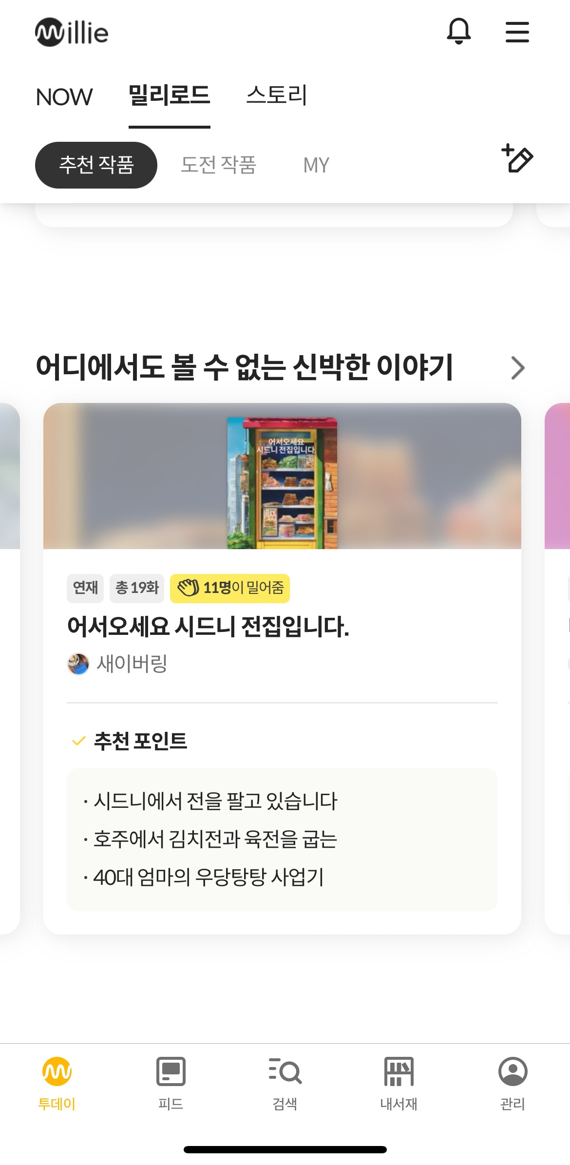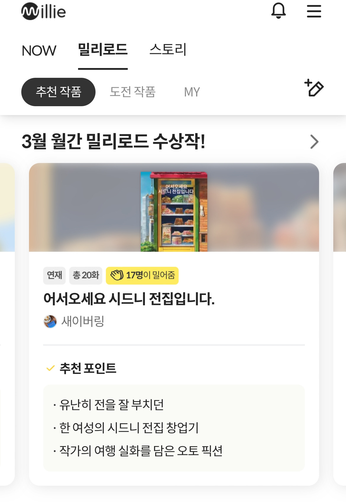 브런치 작가님들도 4월 밀리로드 도전하시고, 밀리의 서재 계정이 있으시다면 밀리의 서재-밀리로드 접속하여 <어서 오세요 시드니전집입니다> 연재글에 ‘*밀어주리’ 응원부탁드립니다.