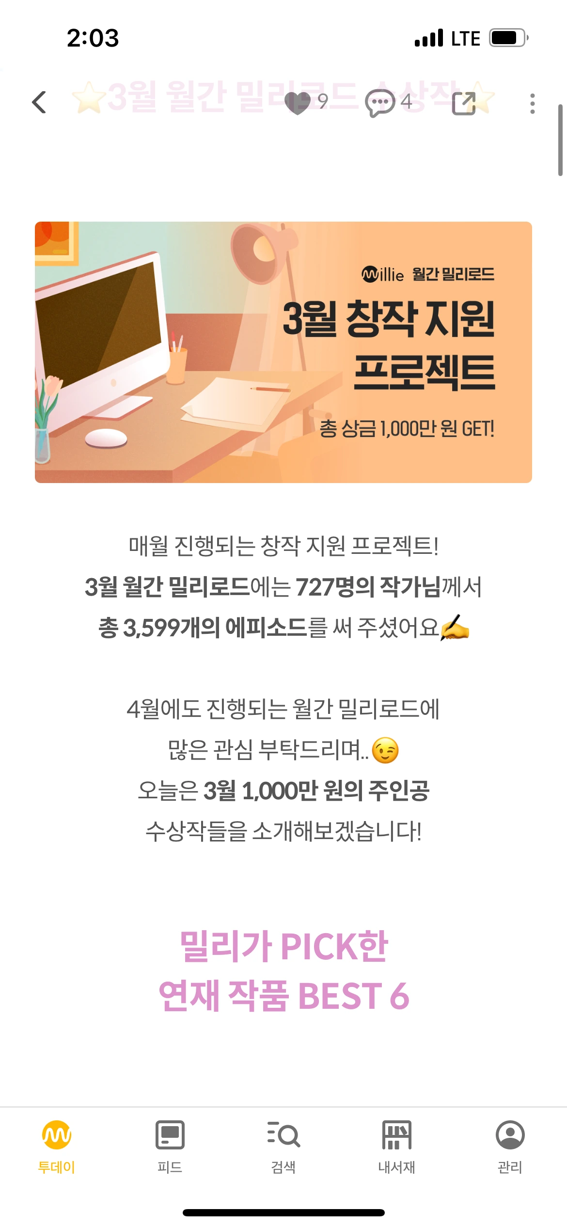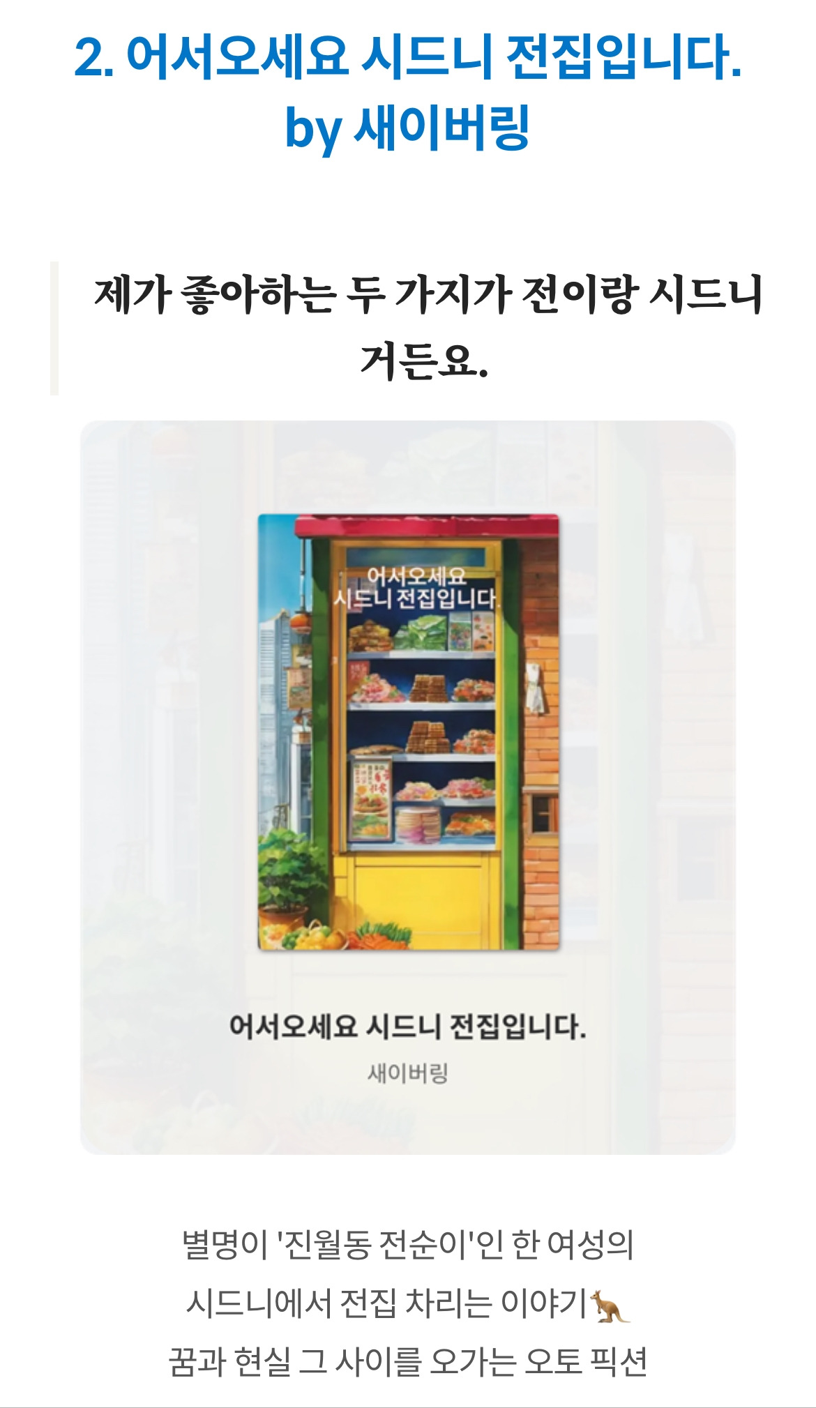 브런치북으로 출간한 <어서 오세요 시드니전집입니다.>를 밀리의 서재 연재플랫폼인 <밀리로드>에도 연재했는데 3월 우수연재상에 당선됐습니다. 검색해 보니 적지 않은 당선금에 매우 놀랐습니다. 그동안 행복한 마음으로 글을 쓰기도 했지만, 수고한 보상을 받은 것 같아 힘이 납니다. <어서 오세요, 시드니전집입니다>는 이야기에 살을 더 붙이고 빠른 호흡을 가다듬어 추후 전자책이나 종이책으로 출판할 계획을 가지고 있는데요. 밀리로드 당선이 발판이 되어주길 바랍니다.