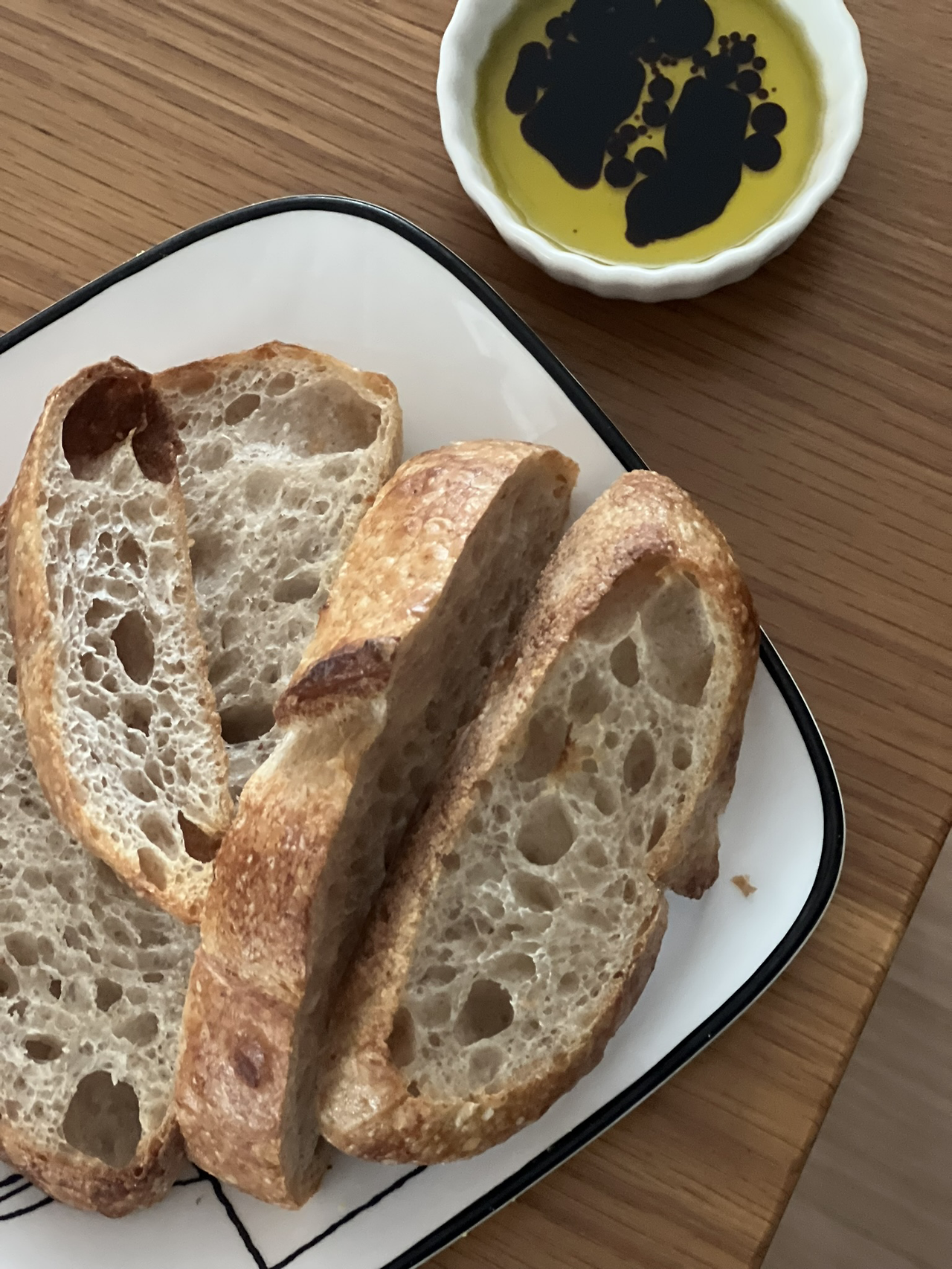 달군 팬에 올리브유를 붓고 튀기듯 구웠다. 접시에 꺼내 열기를 빼고 겉바속촉한 토스트로 만들어 한 입 베어 물었다. "그래, 이 맛이야." 고기를 씹는 듯 감칠맛이 났다. 한 번은 발뮤다 토스터기에 물을 조금 넣고 3분 간 구운 뒤 발사믹&올리브유에 찍어 먹었다. 담백하고 향긋하다. 너무 질기지도 않고, 거북한 밀가루 향도 나지 않았다. 겉이 너무 두꺼우면 씹기 거북스러운데 이곳의 사워도우는 두께가 내 입맛에 알맞았다. 마침내 완벽하게 마음에 쏙 드는 사워도우를 발견한 것이다. 유레카!