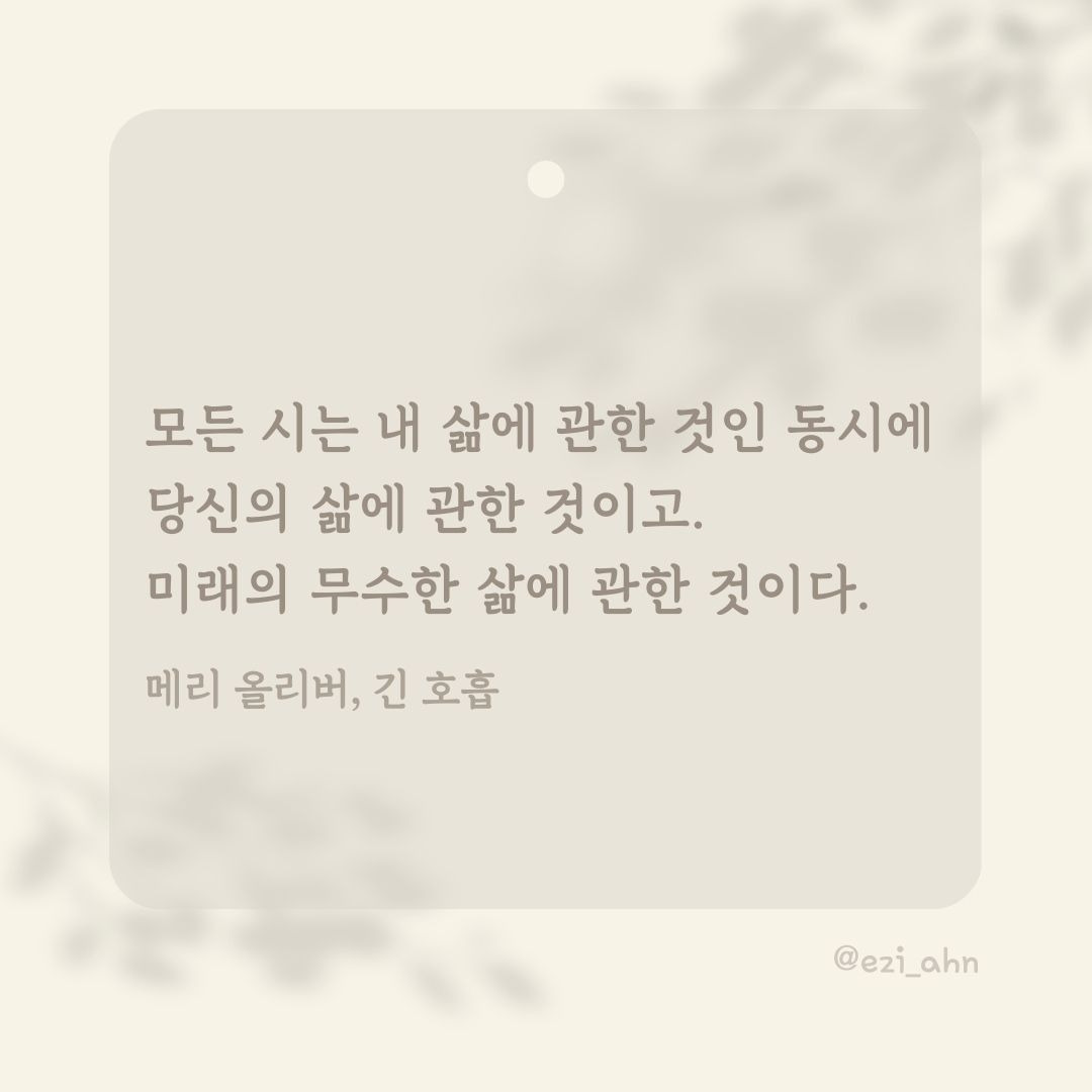 그래, 새로운 환경에 나를 노출시키자! 차일피일 미루던 마음산책 북클럽에 가입 신청서를 보내고 바로 입금했다. 출판사에서 보내주는 신간을 받아 읽고 작가님을 초청하는 북토크 관련 활동에 적극 참여해야겠다고 생각했다. 인생 처음 출판사 북클럽 회원이 되었다. 나 나름대로는 문학을 가까이하겠다는 강제성을 부여한 거랄까. 북클럽 회원이 된 걸 축하한다는 메일을 받고, 며칠 뒤 집으로 택배가 도착했다. 기대하며 뜯은 상자 안에는 '시집'이 다소곳하게 놓여 나의 손길을 기다리고 있었다. 잠시 정적. 으아, 첫 도서가 시집이라니, 막막했다. 표지는 예쁘지만 메리 올리버라는 시인은 누구신지 모르겠고, 시집을 펼쳐보니 왼쪽 면은 영어 시, 오른쪽 면은 한국어 시가 적혀 있었다. 첫 북토크는 이 시집을 가지고 진행된다고 하여, 꾸역꾸역 숙제하는 학생의 마음으로 시를 읽었다.