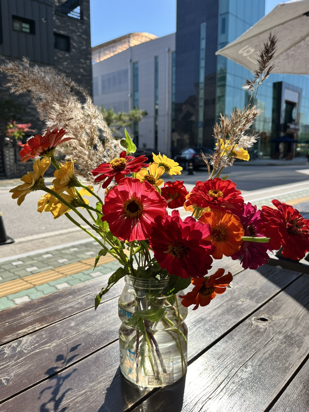 우리가 앉아있던 커다란 나무 벤치 말고도 파라솔이 펼쳐있는 작은 테이블까지. 총 4곳에 정성스레 백일홍 꽃병을 올려두고 꽃의 모양을 매만지는 그분의 모습을 보면서 조용히 생각했다.