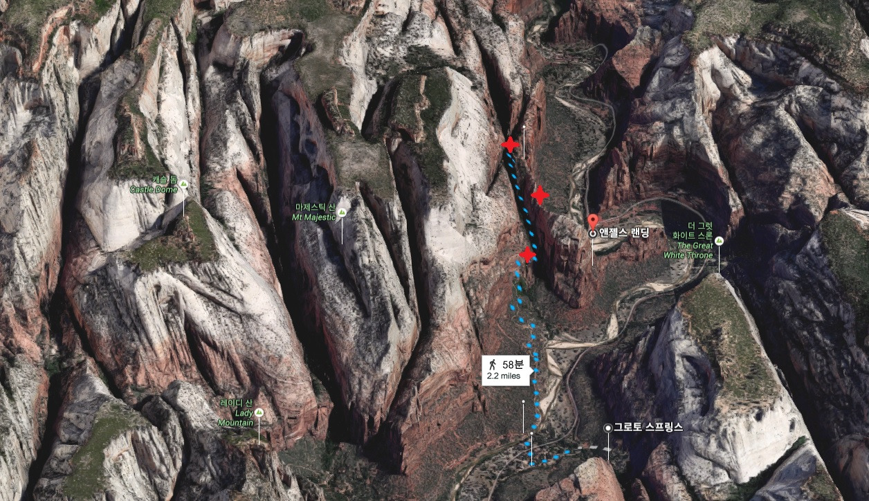 자이언 국립공원 내에는 무료 셔틀이 돌아다니기 때문에 그로토 정류장(Grotto bus stop)에서 내린 후, 파란 점선을 따라 이동하면 된다. 지도 상에서 파란 점선이 가다가 끊겨서 목적지인 앤젤스 랜딩까지 나오지 않았는데, 최종 목적지까지 간다면 총 왕복 거리는 왕복 8km 정도. 저기엔 도보로 58분 걸린다고 나왔지만, 오르막길이고 옆이 계속 낭떠러지여서 천천히 조심히 걸어갈 수밖에 없는 점을 감안하면 체력에 따라 약 왕복 3-6시간 정도 잡고 가야 한다. 지도를 보면 대충 양 옆으로 어떤 광경이 펼쳐질지 상상이 되지 않는가? 고소공포증이 있는 사람에게는 정말 비추 하고 싶은 코스이기도 하다.