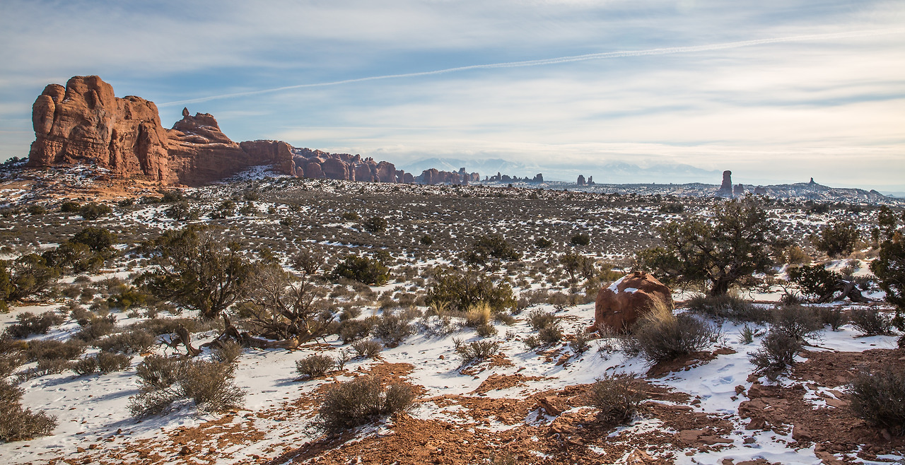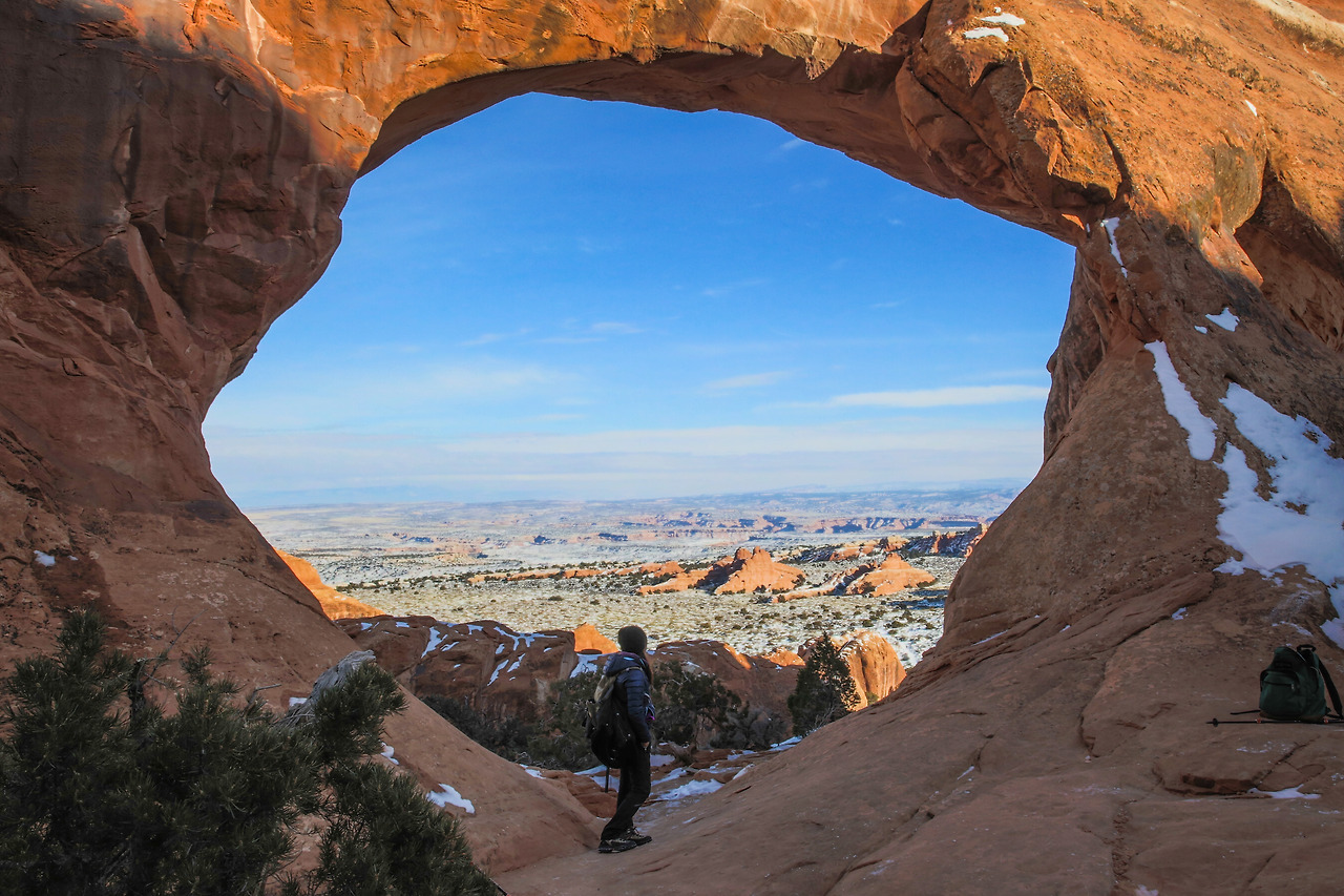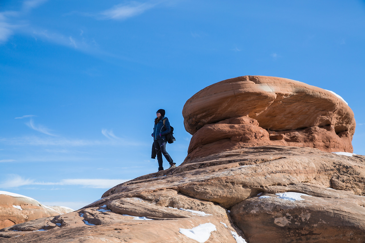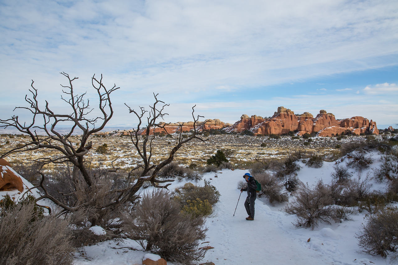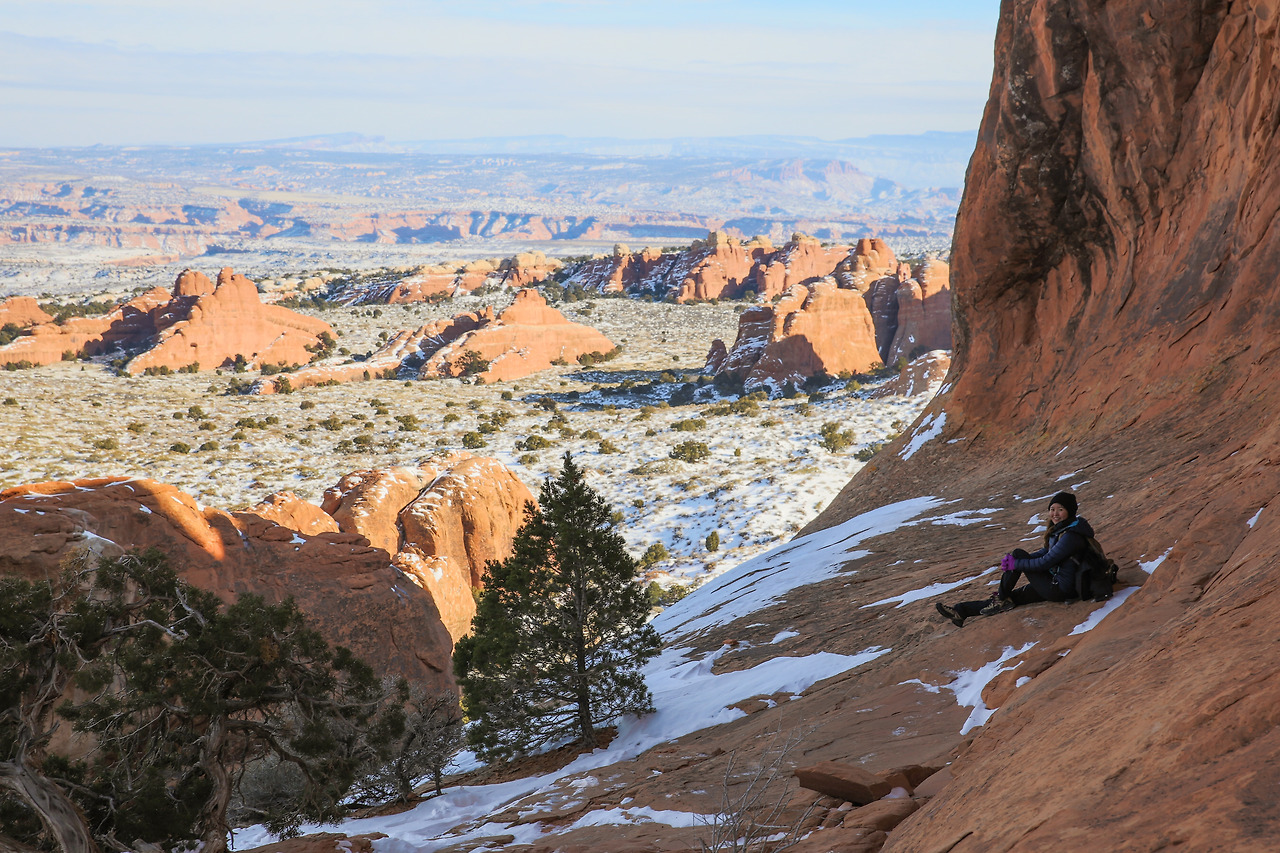 겨울 산행은 생각보다 추웠다. 눈도 생각보다 많이 덮여있었다. 이곳으로 오기 며칠 전, 폭설로 인해 State Emergency(주 긴급상황)이 발령된 뉴멕시코에서 운전해 오며 눈길에 차가 미끄러져 쳐 박히는 경험을 했었다. 그래서 이곳에 오면 조금 눈이 덜 하지 않을까 생각했었는데, 그곳보다는 눈이 적게 온 상태였지만 그래도 여전히 눈이 꽤 많이 덮인 상태였다. 또한 내륙 쪽이어서 그런지 눈이 덮였는데도 꽤 춥다. 바람을 막아줄 바위가 있는 곳은 그나마 바람이 덜 부는데, 뻥 뚫린 평원을 지나가게 되면 추운 겨울 칼바람에 정말 손과 양볼이 시렸다. 그래도 사람들이 드물게 볼 수 있는 겨울의 아치스 국립공원 장관을 볼 수 있으니, 그 얼마나 행운인가. 하고 스스로 위안을 했다.