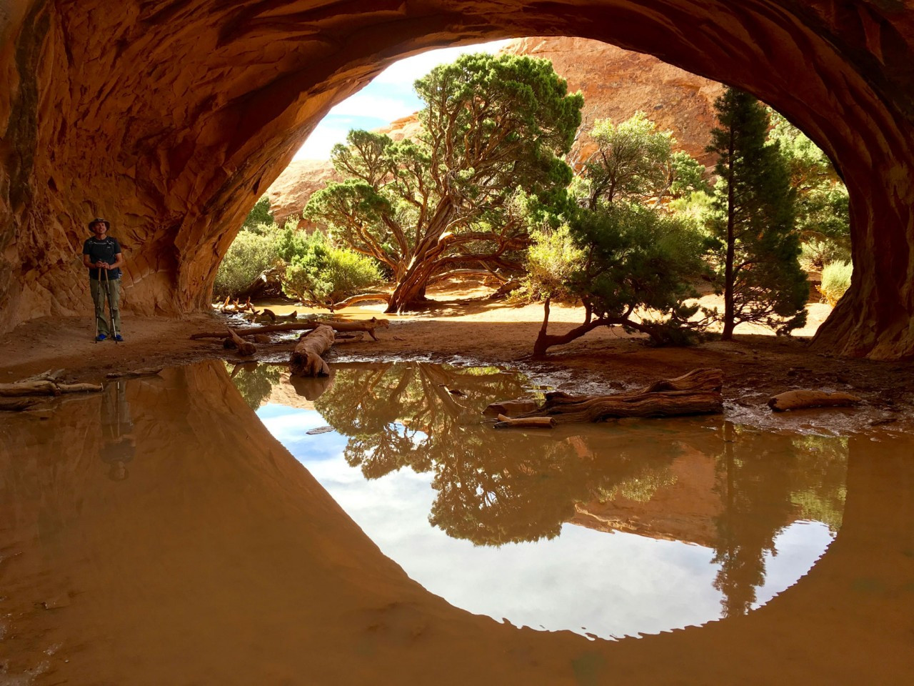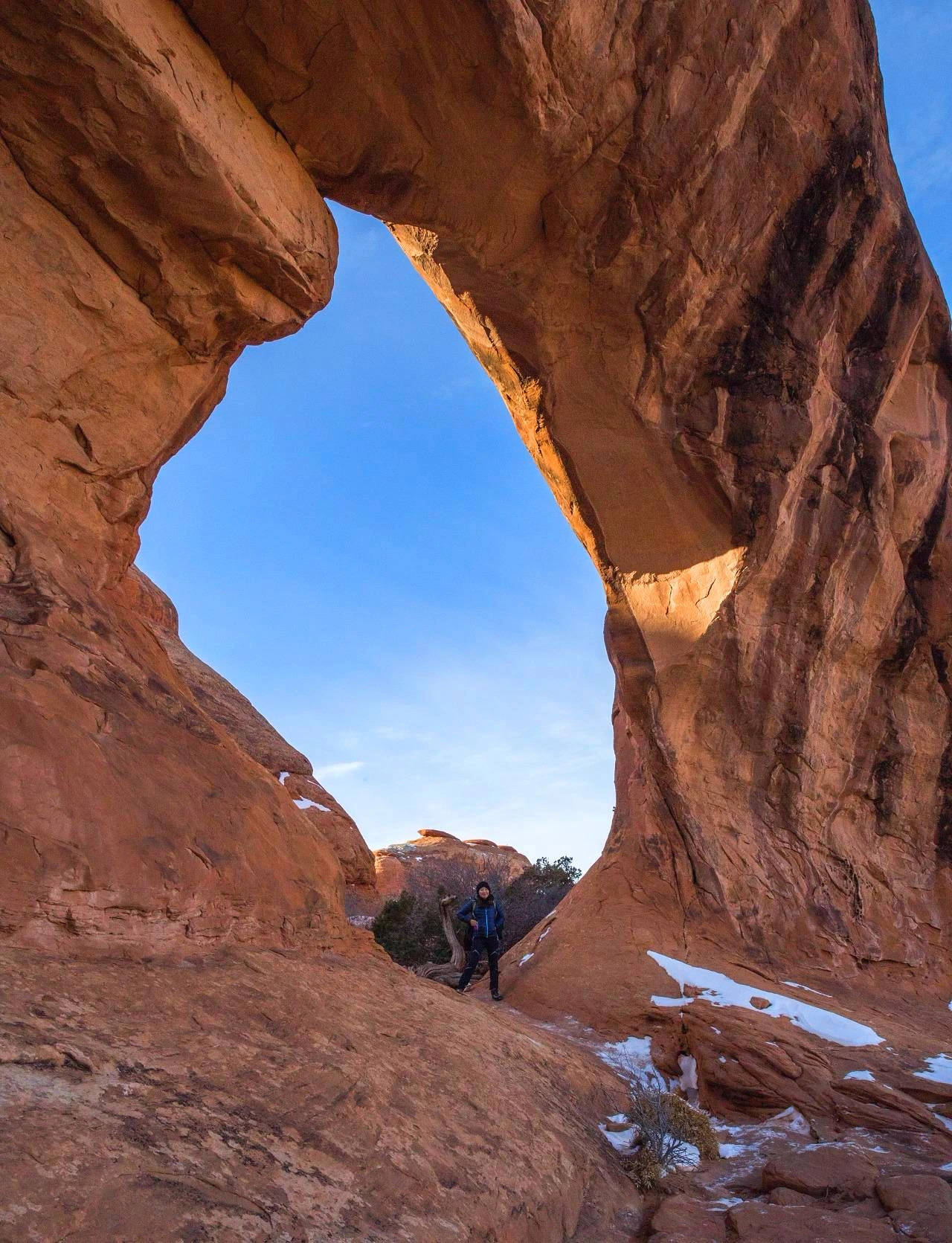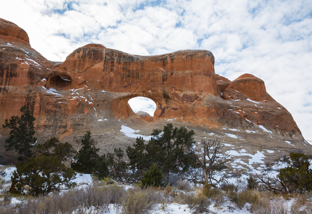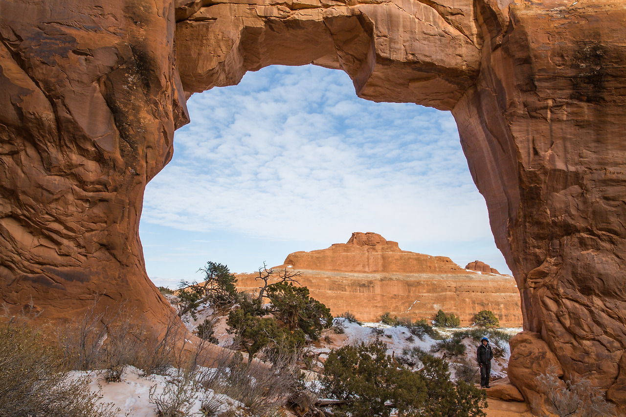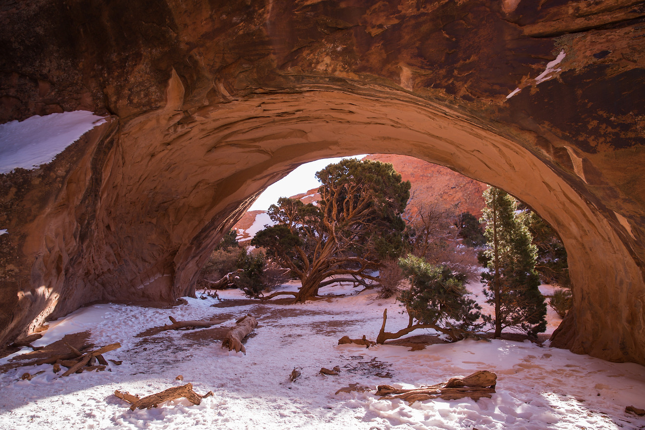 이곳은 파티션 아치에서 그리 멀리 떨어지지 않은 곳인데, 굉장히 다른 분위기였다. 이곳은 작은 동굴 같다는 것이 첫인상이었다. 보통의 다른 아치들은 앞뒤로 널찍하게 뻥 뚫려, 아치를 통해 경관을 볼 수 있는 형세인데 반해서, 이곳은 다른 곳에 비해 굉장히 작은 아치인 데다가 아치 뒤에 좁은 공간이 마련되어있고 바위로 막혀 있어서 마치 작은 동굴에 들어온 느낌이다. 해가 이미 많이 저물어 있었고 이제 한 시간 후면 해가 완전히 질 것 같은 그런 시간이었다. 따뜻하게 내려앉은 햇살이 동글 안으로 비스듬히 비추는데, 빛을 받아 아치 주위가 붉게 빛나고 있었다. 또 그 앞에는 가득하게 눈 덮인 땅, 그리고 이곳저곳에 푸른 소나무. 마치 아름다운 크리스마스 풍경을 선물로 받은 느낌이었다. 겨울에는 이곳이 눈으로 가득 차지만, 여름에는 물이 고여 풍경이 반짝반짝 반사되는 물 웅덩이를 이루는데 그 풍경도 매우 아름답다고 한다.