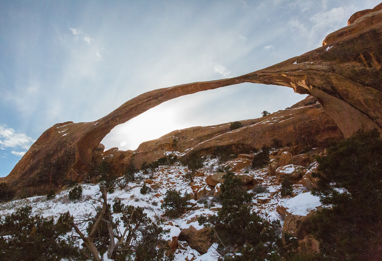 랜드스케이프 아치(Landscape Arch)까지는 조금 걸어가야 한다. 사실 여름이었으면 별 것 아닌 거리였을 텐데도 눈 덮인 길이라 앞으로 나아가는 게 더뎠다. 곳곳에 걸어가며 바위들이 겹겹이 솟아 있는 것을 볼 수 있었는데 그곳에서 저기가 아치다! 아니다! 내기를 하며 남편과 함께 걸어가던 찰나였다. 저기 멀리 아주 길고 가는 아치가 하나 보인다.