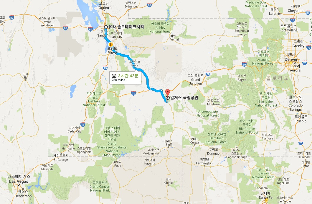 지난 크리스마스 연휴를 뉴멕시코에서 콜로라도를 거쳐 유타로 로드 트립을 했던 우리로서는 남쪽에서 북쪽으로 올라오는 여행 코스였지만, 이곳을 오기 위해서는 대부분의 경우 솔트레이크 시티로부터의 출발을 권한다. 아치스(구글맵에 왜 알처스?로 나왔는지 이해는 안 가지만;) 국립공원 자체만 해도 굉장히 볼거리가 많지만, 그 외에도 그 옆에 캐년 랜즈 국립공원, 데드 호스 주립공원 등 다양한 볼거리가 많기 때문에 이곳에 머무르면서 이곳저곳 구경을 한다 해도 시간이 아깝지 않을 것이다.