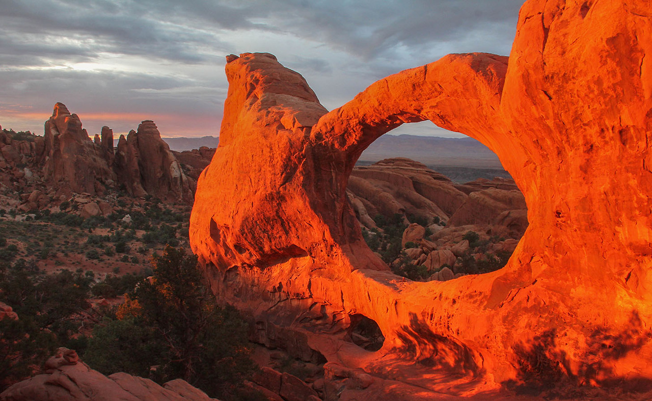 이곳의 경치는 흔히 말하는 아름답다는 풍경은 아니다. 오히려 기이한 별세계 같다는 표현이 더 맞는 표현이 아닐까. 특히나 마지막에 사진으로 덧붙인, 불타는 듯한 더블 오 아치의 풍경을 보면서 지옥이 있다면 이렇게 새빨갛게 불타는 곳이 아닐까 하는 생각도 해 보았다. 사람들이 접근할 수 없도록 이곳저곳을 미로처럼 복잡하게 만들어 놓고 사람들이 길을 잃도록 만들어 놓은, 장난치기 좋아하는 악마들의 정원. 이곳은 아름다운 곳은 아니지만, 마치 다른 행성에 온 듯한 착각을 불러일으키게 만들어서 또 다른 의미의 탄성을 자아내는 그런 곳이다. 우리가 평생 동안 화성이나 달에 직접 가 볼 수 없다면, 이곳에 와서 한 번 하이킹을 해 본다면 간접 경험은 할 수 있지 않을까 한다.