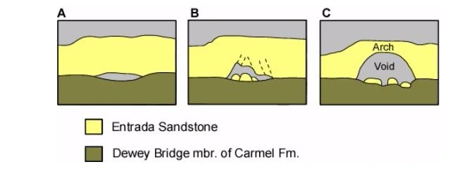 아치스 국립공원은 말 그대로 아치(Arch)가 많아서 생긴 국립공원이다. 미국 한복판에 있는 유타 주의 솔트레이크 시티에서도 알 수 있듯이 이곳은 과거에 바다였다. 하지만 바다 밑부분이 해발고도 2000m 이상으로 융기하면서 바다의 밑바닥이 육지로 드러나게 된 것이다. 바다 밑바닥에는 두꺼운 소금층으로 이루어져 있었고, 그 아래에는 두터운 사암, 아래 그림에서 노란 층으로 형성되어있었다. 또 그 아래 부분은 쥐라기 시대 때의 화산 지형으로 형성된 석회암 지반(잔디색 부분). 시간이 흐르면서 소금은 녹아 없어져 버리게 되고 사암층이 표면으로 드러나게 되었다. 그런데, 이 지역은 해발고도가 높고 대륙 쪽이라 일교차가 하루에도 30도 이상 나기도 한다. 극심한 일교차로 인해 풍화작용도 활발이 일어나게 되었는데, 이 사암층으로 물이 흘러들다가 석회암으로 잘 스며들지 못 하고 고이게 되면서 큰 구멍을 만들기 시작했다. 이 구멍이 점점 커져서 생긴 것이 바로 아치. 이 아치스 국립공원 내에는 이런 크고 작은 아치들이 2000여 개 정도 곳곳에 분포되어 있다고 한다.