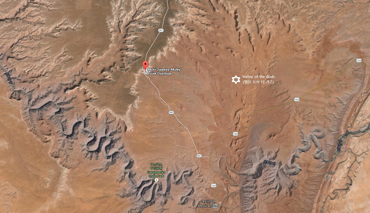밸리 오브 더 가즈는 사실 입구를 굉장히 찾기가 어렵다. 사실 나 역시도 목적지로 딱 지정하고 간 것이 아니라, 163번 도로를 따라 운전해 가다가 창 밖 풍경이 너무도 멋있어서 잠깐 오프로드 샛길로 차를 돌려 새어 보자고 했던 것이었는데 나중에 알고 보니 그곳이 유명한 '신들의 계곡'이었던 것이다. 아래 지도에서와 같이 딱히 길이 나 있지도 않고 표지판 마저도 아주 작아서 정말 정신 똑바로 차리고 있지 않으면 알 수 없는 곳이다. 남서쪽을 향해 163번 도로를 달리다가 261번 도로가 만날 때쯤이 다가왔다면 정신을 바짝 차리고 주위를 둘러보며 운전하는 게 좋을 것 같다.