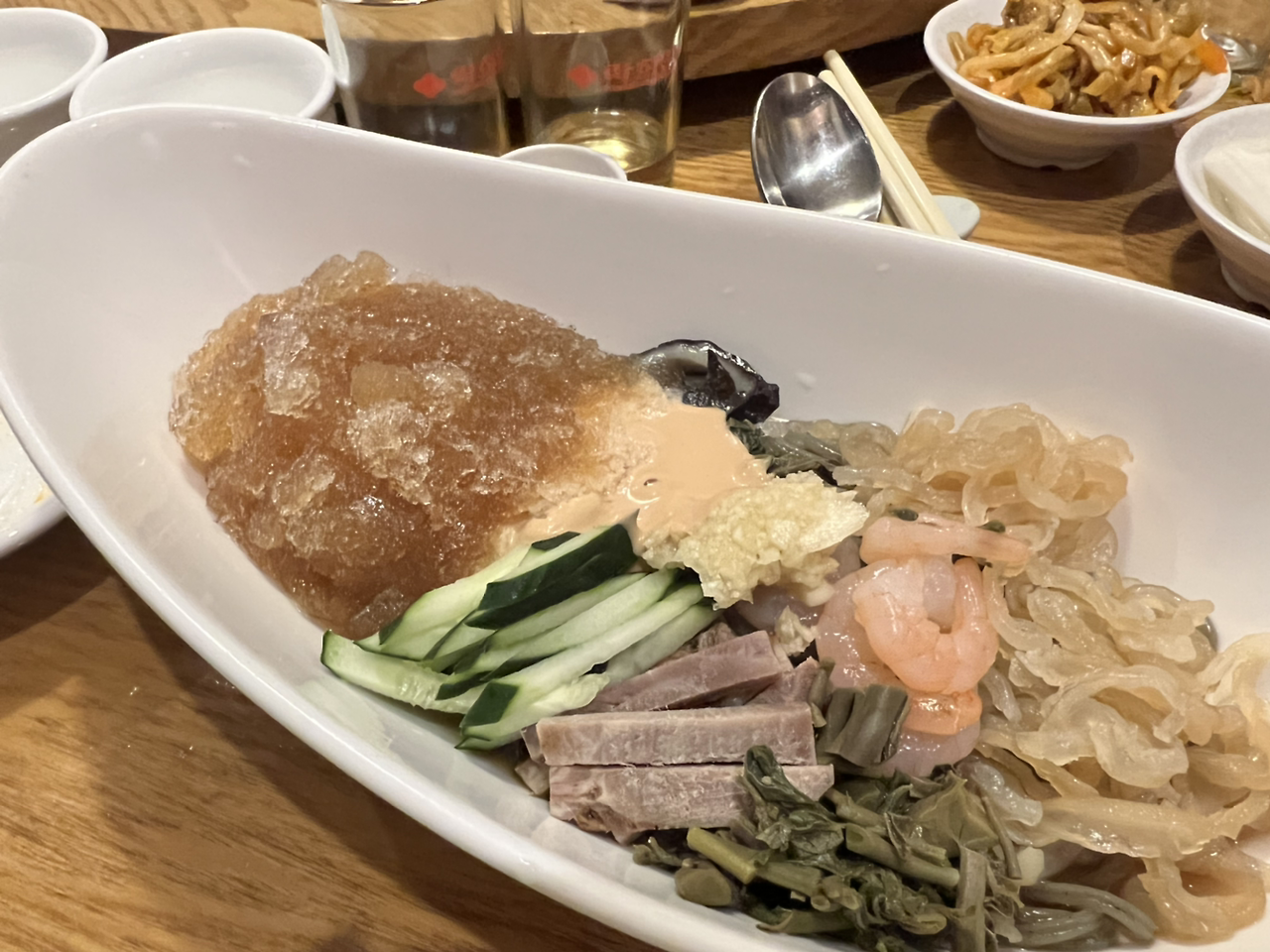“중국식 냉면이 원래 깐빤몐(乾拌麵)이라 하여 육수가 많이 없는 자작한 스타일인데 한국분들이 냉면 하면 육수를 떠올리시기 때문에 점점 육수 비율이 높아졌습니다. 개중엔 못난이 육수 쓰는데도 있고 고명도 다양한데 전통적인 한국의 중식 냉면의 중요한 키는 저는 땅콩소스와 가죽 나물이라고 생각합니다. 가죽나물은 아시겠지만 봄에만 잠시 나는데 저희는 연태의 큰아버지께 부탁해 공수해온 가죽나물을 사용하고 있습니다. 염한 짭조름한 가죽나물과 땅콩소스 푼 육수에 여러 고명 넣은 중국냉면입니다.”라는 답이 왔다.