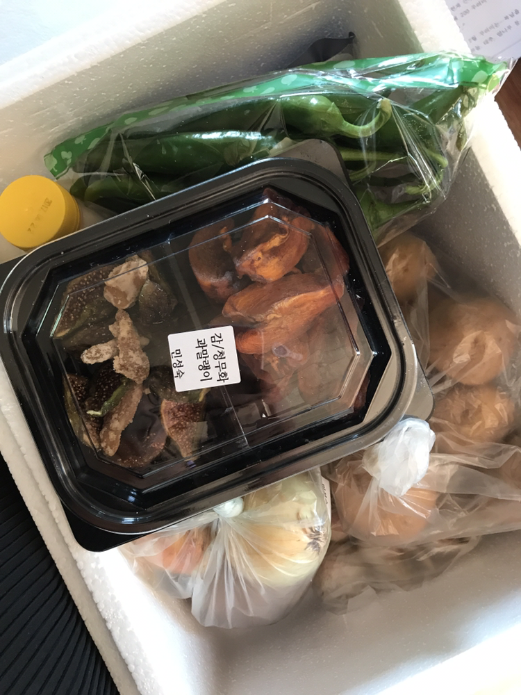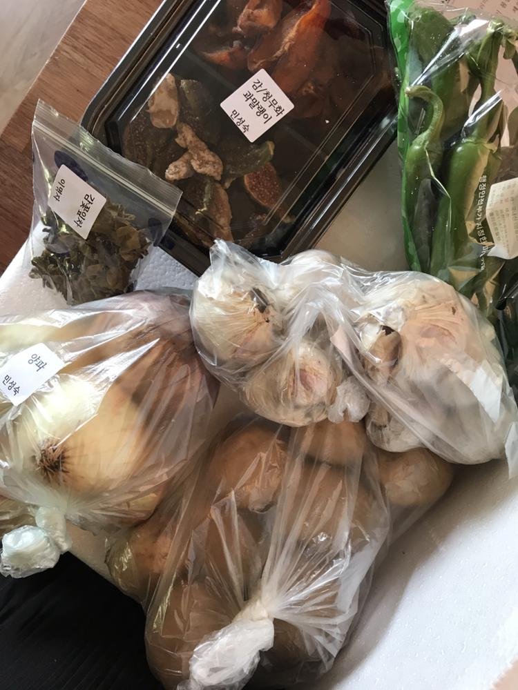 이번 달에 햇감자, 햇양파, 햇마늘, 얼갈이 김치, 감꽃잎차 등이 들어있었습니다.