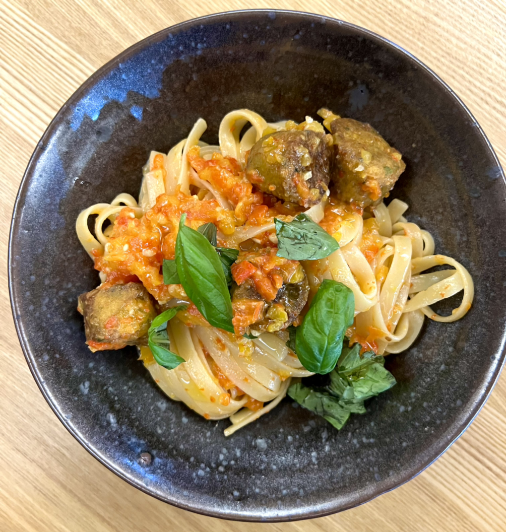 저녁엔 인테이크의 베지볼을 구워 넣은 파프리카 파스타를 했다. 파프리카를 구운 후 껍질을 벗겨 올리브 오일과 소금을 조금 넣어 갈면 파프리카 페스토가 된다. 이 페스토를 차게 식혀 두고 삶은 파스타와 섞기만 하면 되니 무척 간단하다.