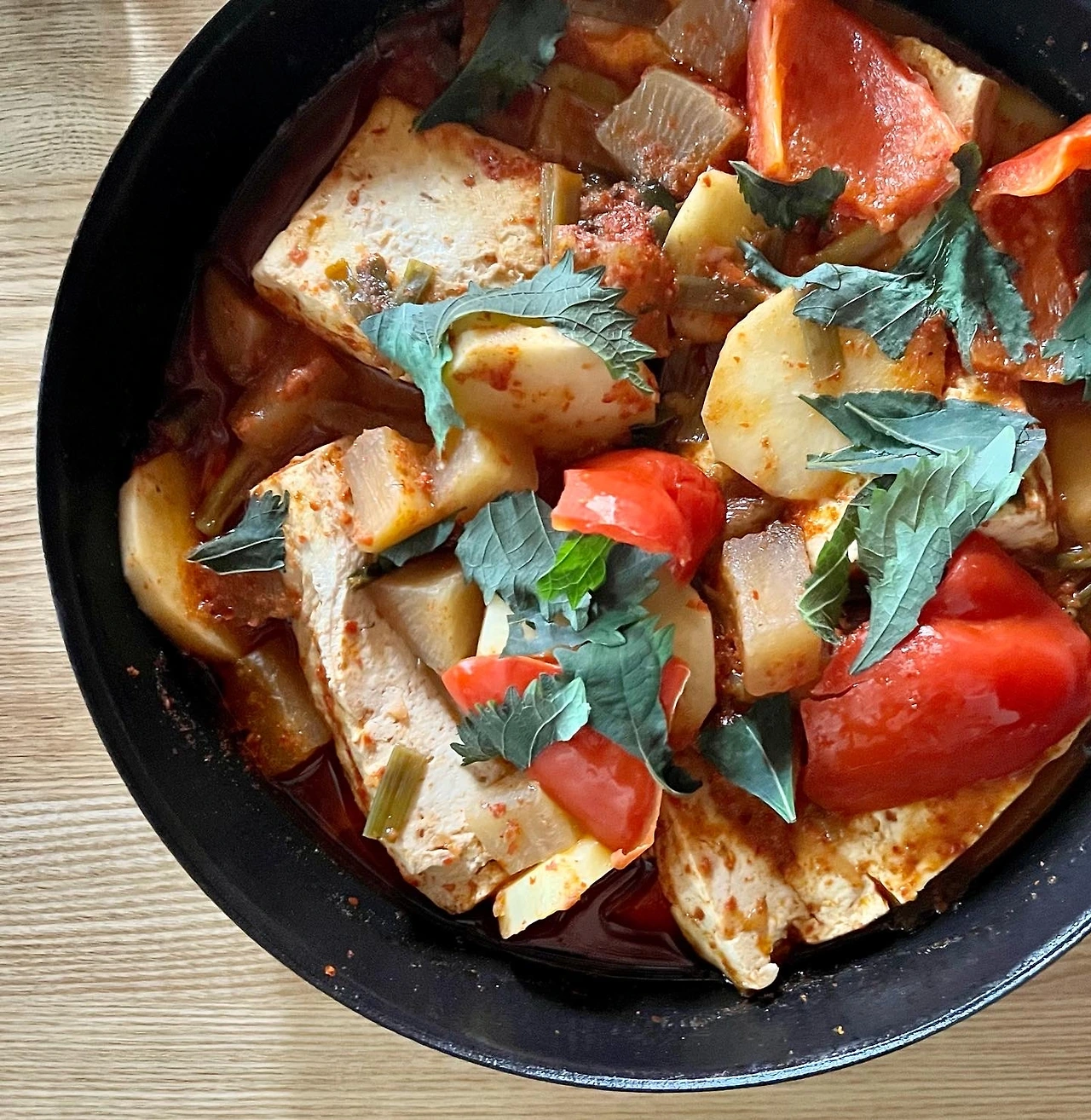 두부 올리브 오일에 지지다 김장 때 담근 굴깍두기 다 먹고 국물만 남았다. 그 국물 붓고 고춧가루 조금, 설탕 1 숟갈 넣어 오래 지졌다. 지지다 갑자기 생각나 감자와 파프리카도 넣었다. 원 팬 요리 별 거 없네! 들기름 떨어져 요즘 베제카 올리브 오일이 열일 한다. 역시 냉장고를 뒤지면 뭐든 나온다. 여기에 창의력을 살짝 발휘하면 한 끼를 행복하게 먹을 수 있다.