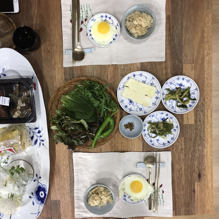 달걀은 3년째 먹고 있는 진주의 [자연이네 유정란]이고 루꼴라와 상추는 [제 텃밭]에서 수확하였고 된장은 제가 담근 겁니다. 된장의 원재료인 콩은 지리산의 것 소금은 한주소금입니다.