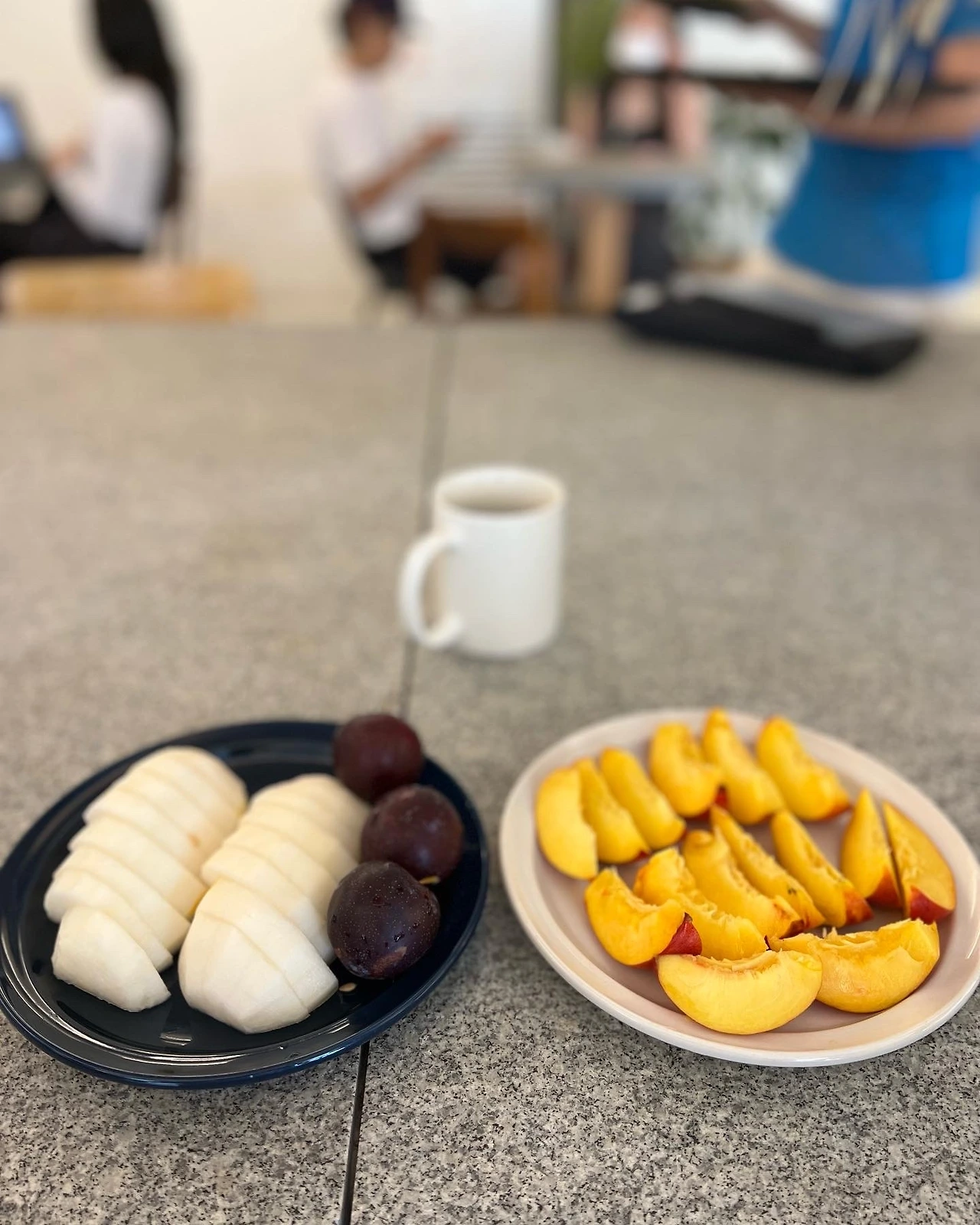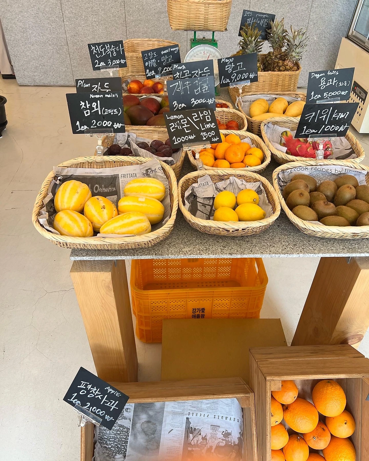 커피와 과일은 해방촌 <흠 마켓>은 지역 농산물을 파는 카페다. 채소를 아주 조금씩 팔기도 하고 레시피와 함께 그에 필요한 식재료를 판다. 무엇보다 음료와 과일을 함께 주문하면 과일을 먹기 좋게 손질해 준다.