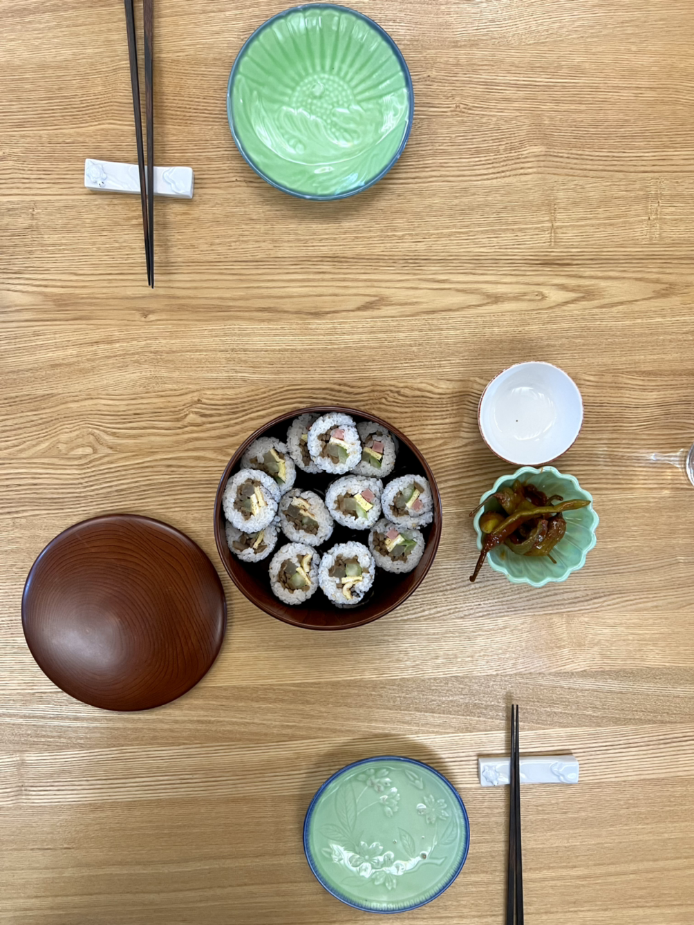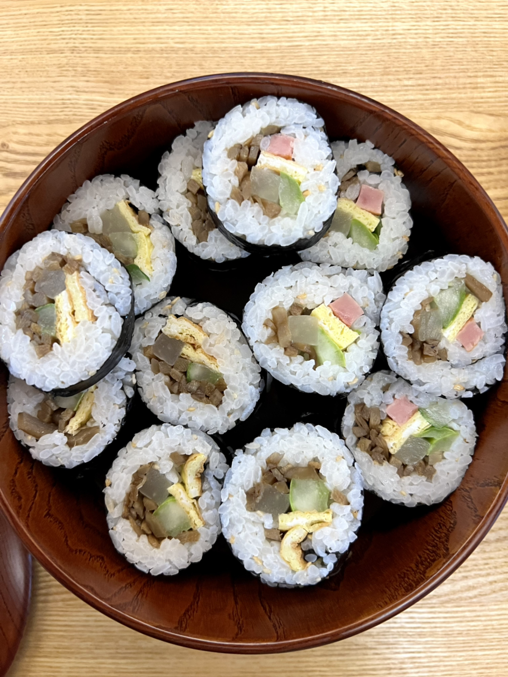 김밥 집에 갈 땐 늘 고급 나무 합을 들고 간다. 이 합엔 김밥을 두 줄을 담을 수 있다. 쿠킹 포일에 싸인 김밥보다 보기도 좋고 맛도 더 좋게 느껴진다. 사와 바로 식탁에 올려도 괜찮다. 두 줄 중 한 줄은 영아네 김밥 스타일로 다른 한 줄은 햄 대신 계란이 두 줄 들어간 페스코 베지테리안인을 위한 방식으로. 손님 중에 김밥에서 햄을 빼 달라고 주문이 최근 많이 늘었다고 한다.