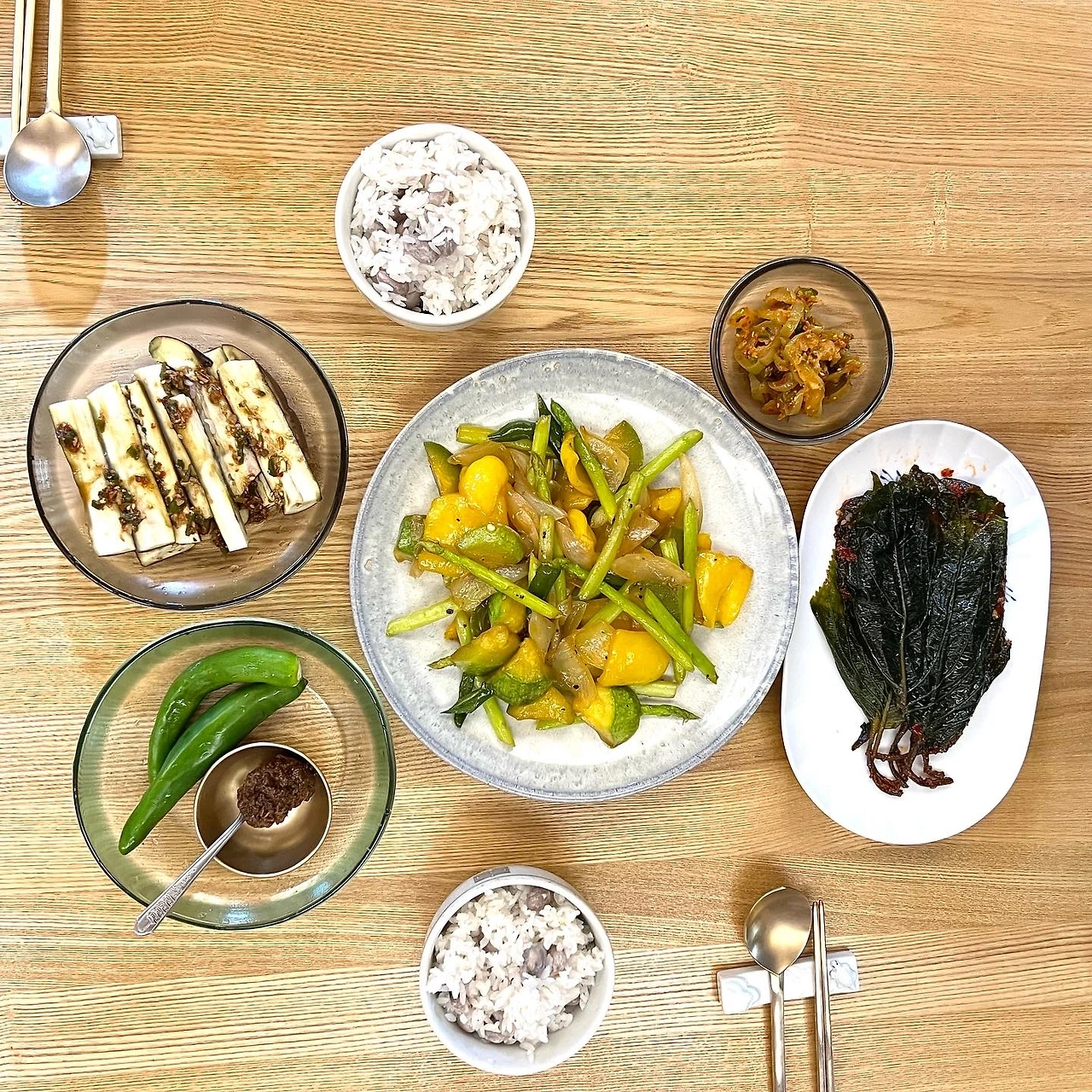 오늘의 채소볶음도 그렇다. 올리브오일을 팬에 넉넉히 두르고 거기에 양파, 호박, 아스파라거스, 파프리카를 넣고 소금 살짝 뿌린 후 간장을 넣어 맛을 내면 된다. 무척 간단하다. 그런데 이 채소볶음을 상에 올리면 밥상에서 빛이 난다. 긴 비 끝에 햇살이 비친 오늘날씨처럼.