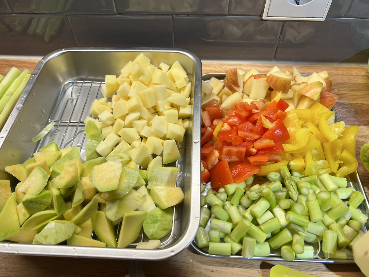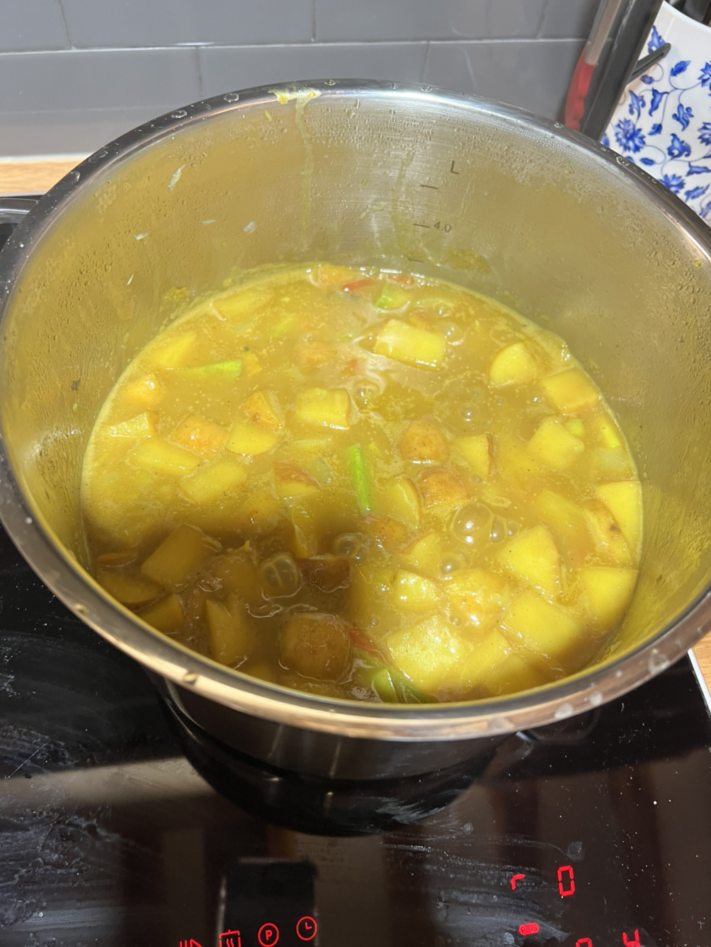 살림을 게으르게 하면 냉장고에서 표가 난다. 냉장고에 오래된 채소와 과일이 제법 뒹굴고 있다. 호박, 싹이 난 감자, 말라가는 파프리카, 조그라드는 아스파라거스, 푸석해진 사과 모두 넣고 볶다 물을 부었다. 집에 있던 카레 가루의 봉지 설명을 살펴보니 아무래도 단 맛이 강할 것 같아 각종 허브와 페페로치노를 추가하고 끓였다. 채소가 익고 카레를 넣고 맛 보니 맛이 맹숭맹숭하여 간장을 살짝 넣으니 그제야 맛이 잡혔다.