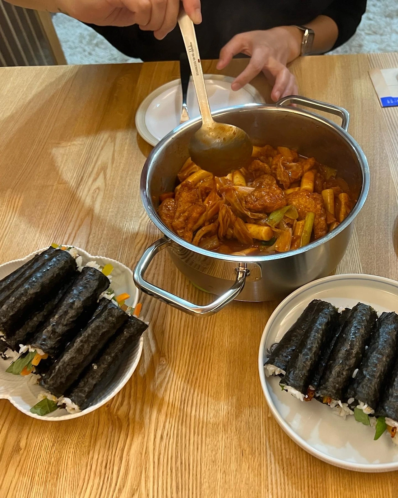 역시 떡볶이는 밀떡에 설탕이 들어가 줘야하고 어묵대신 사용해 본 유부는 훌륭했다. 레시피는 고추가루 1: 고추장 1.5: 양조간장 2: 설탕 1.5 비율이었다. 보통 레시피엔 설탕은 2다. 설탕을 넣는 것에 죄책감이 들어 유기농 황설탕을 사용했다. 고춧가루는 작년에 내가 판매한 명품 고춧가루 고추장은 동네 주민 성화숙님의 것, 양조간장은 샘표, 유부와 떡볶이 밀떡은 돈암시장 한냉상회에서 구매했고 꼬마김밥엔 내가 만든 고추지와 깻잎을 넣었다.
