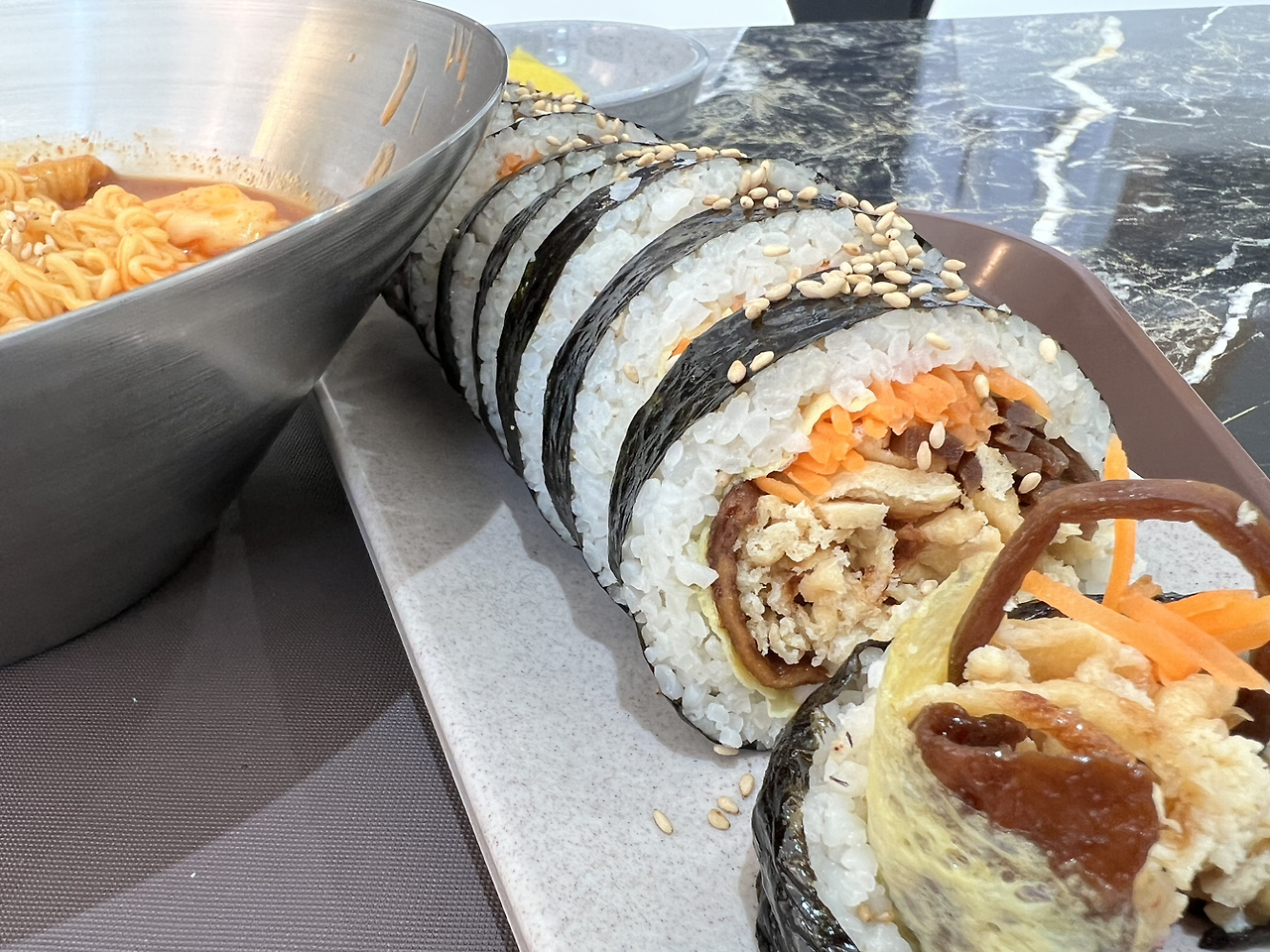 김밥 한 줄이면 내 위장은 꽉 차지만 혼자 들어가 달랑 김밥 한 줄 시키기는 조금 미안해 언제나 뭔가를 더 주문해 남기고 나온다. 어젠 잔치국수, 오늘은 라볶이였다. 잔치국수와 먹은 김밥은 대충 말은 기본 김밥였는데 밥을 잘 지어 맛있고 과하지 않아 국수와 먹기 딱 좋았다. 라볶이와 먹은 유부 김밥은 김밥을 크게 말아 옆구리가 터질 뿐만 아니라 한 입에 넣기에 어려움이 많았고 속재료가 과하게 들어가 라볶이와 같이 먹기엔 과했다.