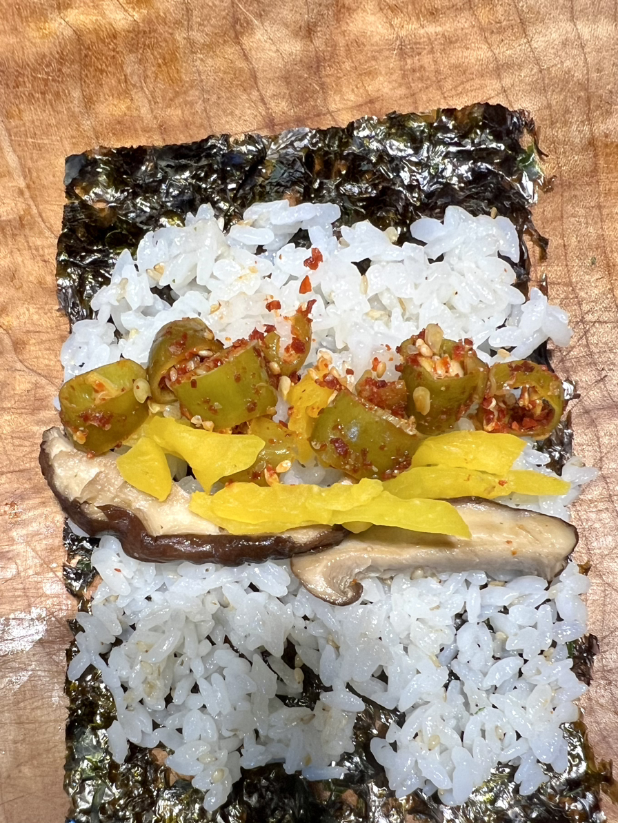 그리고 김 위에 밥 올리고 속재료 넣어 돌돌 만다.