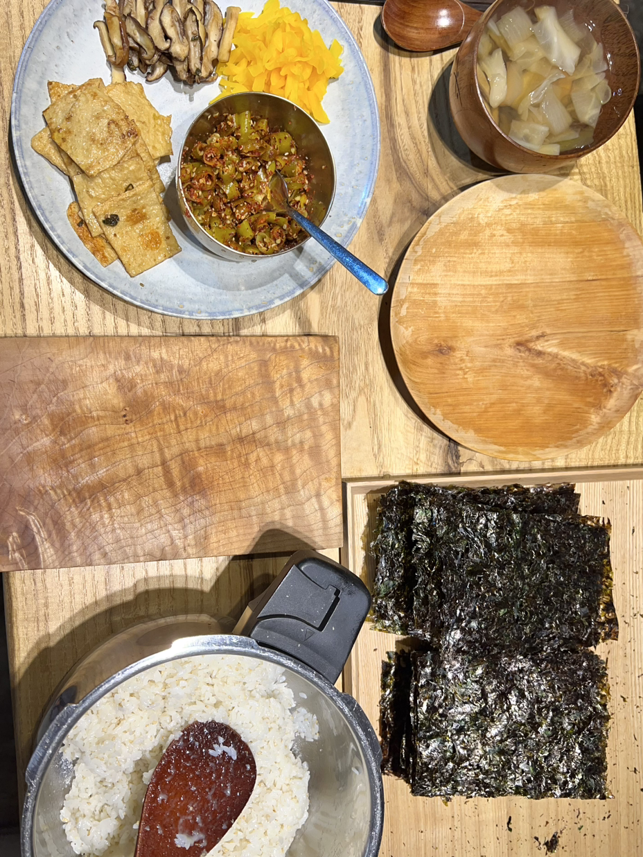 남편이 강연 촬영이 있다고 하여 후다닥 밥을 먹일 생각으로 꼬마김밥을 말았다. 냉장고에 있던 오래 묵은 곱창김을 구워 4 등분하고 냉장고에 있던 재료들을 사용했다. 보통 김밥은 왠지 꼭 넣어야 할 김밥 속재료기 있어야 할 것 같은데 꼬마 김밥은 아무거나 원칙 없이 넣어도 될 거 같아 마음의 부담이 적다.