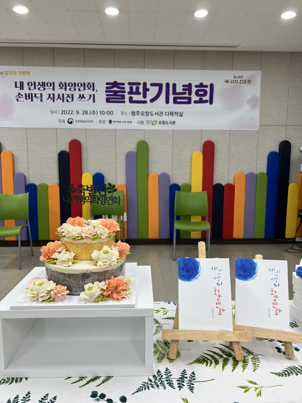 지난 10주 동안 청주 오창도서관에서 손바닥 자서전 쓰기를 남편과 같이 진행했다. 총 10회 강연 중 5회는 대면 5회는 비대면으로 진행했고 오늘은 마지막 날로 참가자들이 그동안 쓴 글로 엮인 책을 가지고 출판 기념회를 가졌다. 총 20명 수강생 중에 16명이 자신의 이야기를 썼으니 대단한 성과가 아닐 수 없었다. 애초 기획에 책 출간은 없었지만 종이에 인쇄된 자신의 이름과 글을 보면 그 감동이 크다는 것을 알기에 책도 출간하자고 했다.