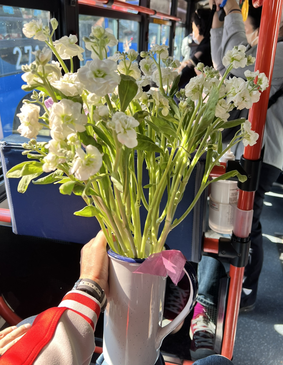동네 친구 정옥 씨는 공간 재생 전문가다. 그가 문래동에 재생시킨 공간 <도시간>에서 전시를 한다고 하여 갔다. 전시 공간에서 손님을 맞이하라고 꽃을 들고 갔다. 동네 꽃집에서 꽃을 사서 손질하고 아끼던 화병에 꽂고 물을 채워 들고 갔다. 마침 버스에 사람이 많아 매우 조심하며 꽃을 들었다.