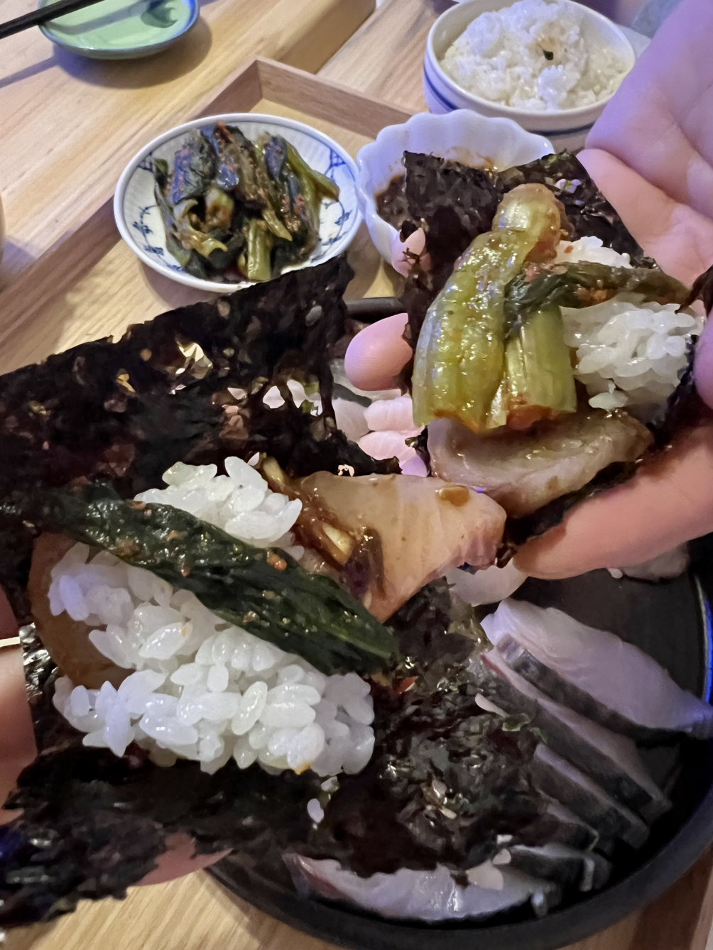 김 위에 양념 듬뿍 바른 삼치를 얹고 그 위에 잘 익은 갓김치를 올린다. 갓김치의 알싸한 맛이 고추냉이 역할을 한다. 그리고 싸서 먹는다. 여기까진 김태윤 요리사의 설명. 나는 여기에 밥을 추가한다.
