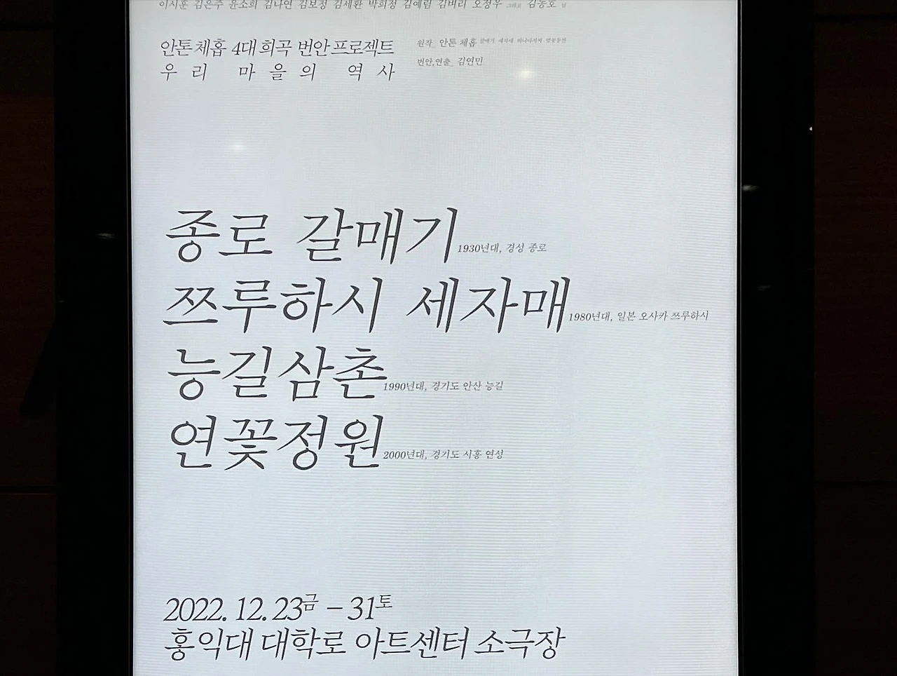 올해 어느 해보다 연극을 여러 편 보았다. 올해의 마지막 연극은 안톤 채홉의 4대 희곡인 바냐 아저씨, 벚꽃동산, 갈매기, 세 자매를 우리 정서와 이야기에 맞게 번안한 프로젝트 공연이었다. 네 편의 공연 총 540분을 하루 종일 보는 공연였는데 인터미션과 식사시간이 있어 힘들지 않게 볼 수 있었다.