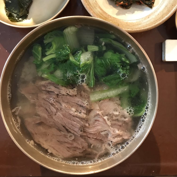 아! 하는 탄성이 절로 나올 만큼 담백하고 동시에 깊은 맛이었다. 반찬으로 나온 명이나물을 보자 본능적으로 나물에 고기를 싸먹었다. 밥숟가락에 밥과 고기와 얼갈이를 수북히 푼 후 고들빼기 김치를 조심스럽게 올려 최대한 입을 크게 벌려 국밥을 먹었다. 너무 담백해 자칫 심심할 수 있는 국밥에 고들빼기김치는 밋밋한 흰블라우스에 맨 스카프처럼 활력이 되었다. 먹는 동안 웃음이 절로 나왔다.