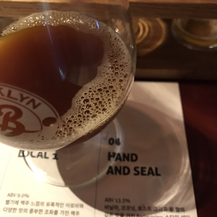 내가 놀란 맥주는 디저트주로 나온 13.3고의 핸드 앤 실, 이 맥주는 상온으로 마시면 흡사 꼬냑을 마시는 느낌이 들 것 같았다. 그들의 설명대로 브루클린와인스타일 에일, 딱 그 느낌였다.