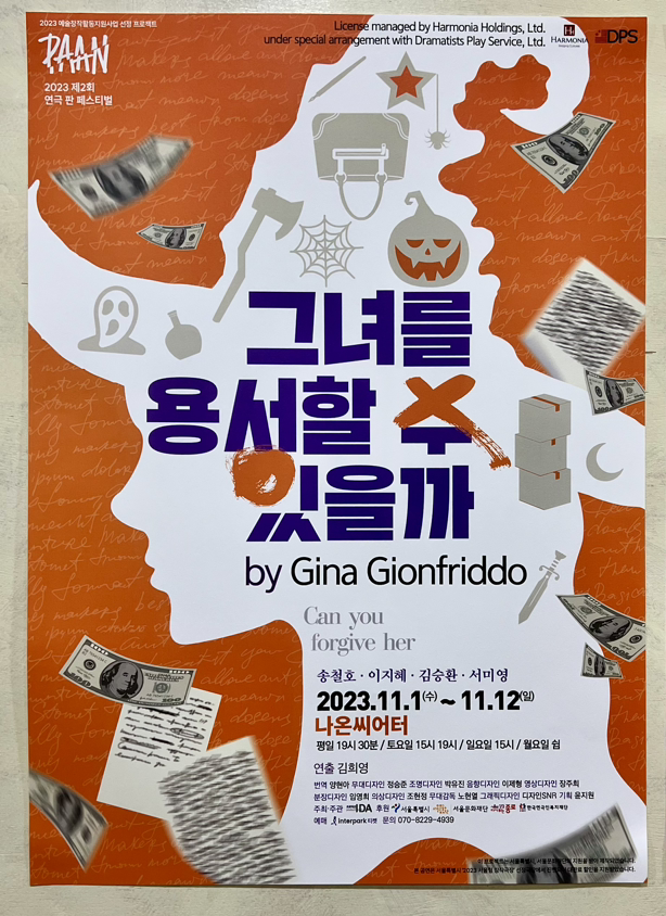 좋은 희곡으로 공연되는 연극을 보는 쾌감은 매우 크다. 좋은 희곡인 것을 어떻게 아냐고? 보다 보면 안다. 보면서 납득이 되고 절로 극에 몰입되며 빌런이 귀여워 보이기도 한다. 미국의 드라마 작가이며 극작가인 지나 기온프리도가 쓴 연극 <그녀를 용서할 수 있을까?>가 그랬다. 120분 동안 온전히 극에 빠져 든다.