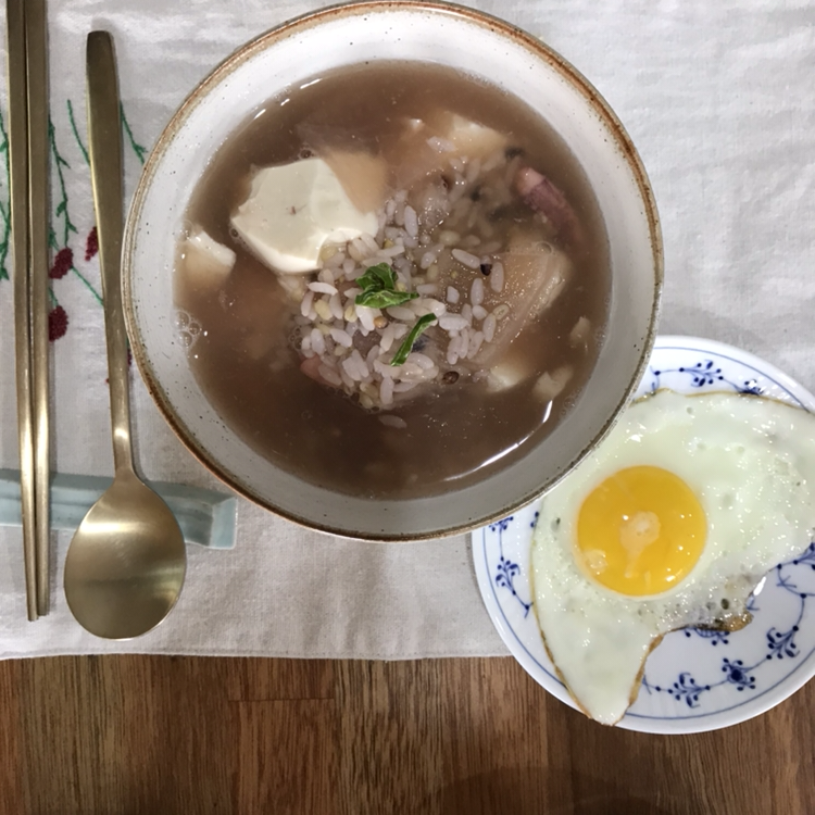 오징어뭇국을 끓이다 찬밥을 넣고 끓였다. 이렇게 국밥이 되었다. 혹시 짤지도 몰라 연두부를 더 넣어 양도 늘리고 짠 맛도 잡았다. 그래서 결국 두부오징어무국밥이 탄생했다.