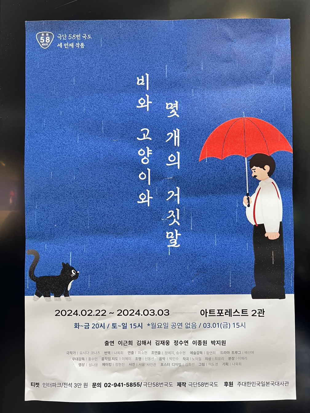 연극을 보는 동안 재미있는 공연이 있고 보고 난 후 여운이 긴 것이 있다. 연극 <비와 고양이와 몇 개의 거짓말>은 후자의 공연이다.