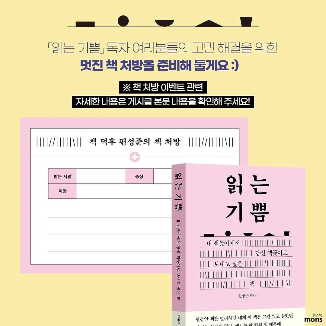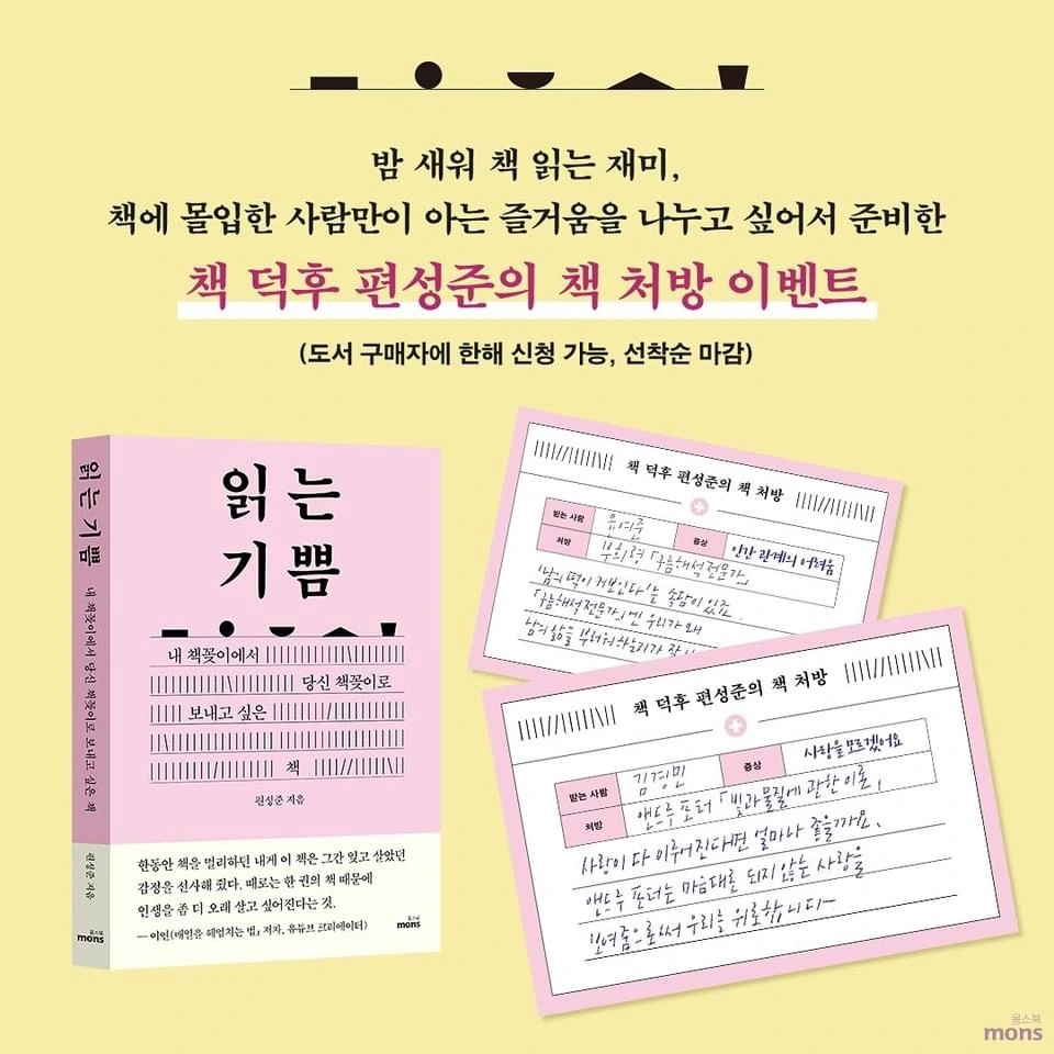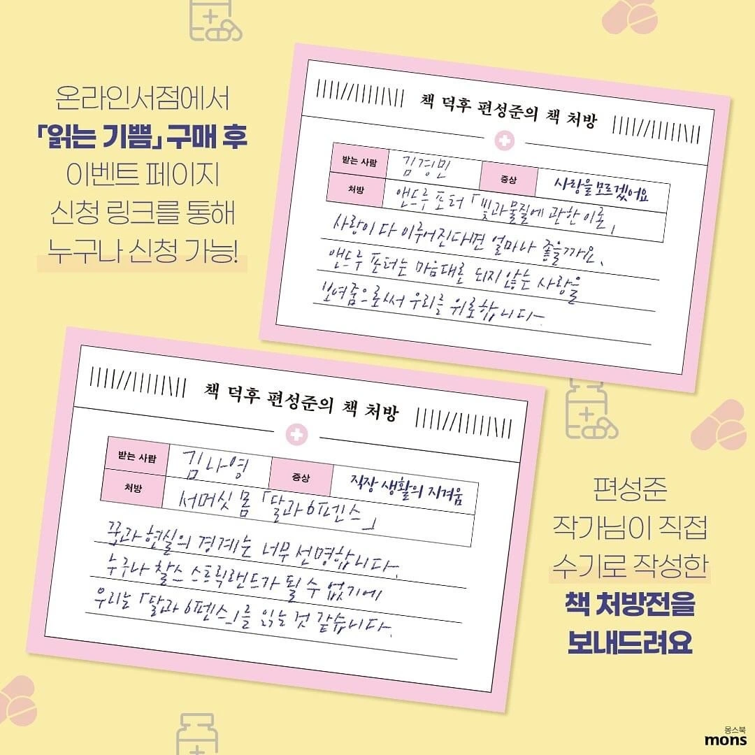 예약 구매자에겐 책 처방 이벤트도 하고 있어요. 편성준 작가의 손글씨가 이쁜데 고민을 남기시면 손글씨로 처방전을 써준다니 소장 가치 있겠죠.