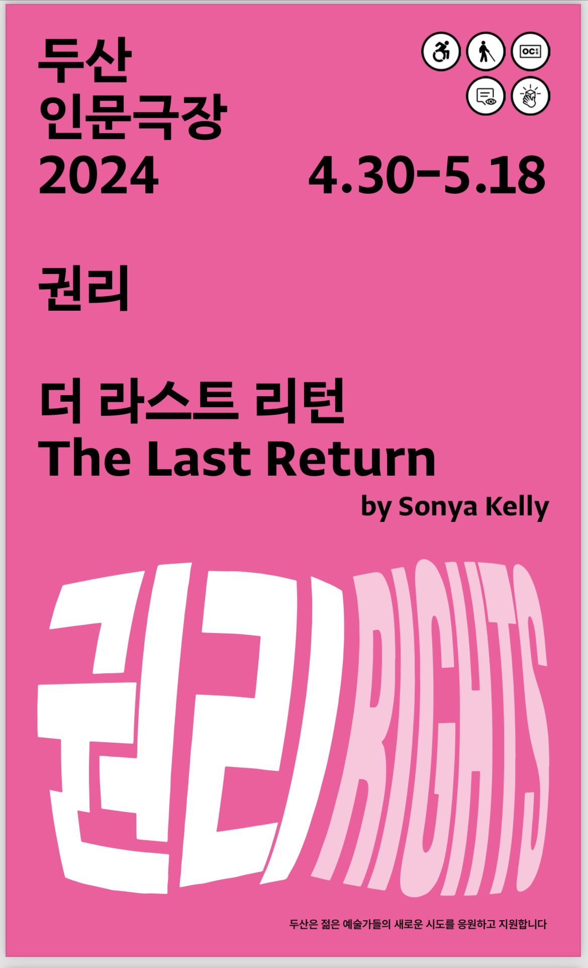 두산아트센터는 매년 사회적 이슈를 주제로 강연과 공연을 진행하는데 올해의 주제는 ‘권리’이며 이 연극은 그 프로그램 일환이다. 추천한다.