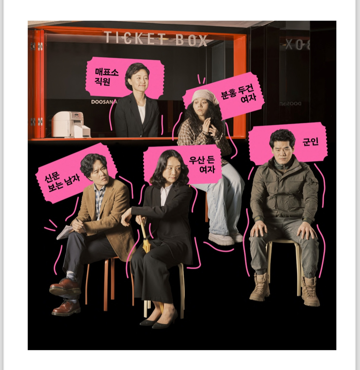같은 상황 나라면 어떻게 했을까 생각해 본다. 아마 나는 취소표를 잡기 위해 극장에 가는 일조차 하지 않을 것 같다. 취소표를 잡는 게 내 권리라면 나는 그 권리를 그냥 잡지 않을 것이다. 그러나 연극 속 매표소 로비는 그렇지 않다. 요실금으로 서른여섯 번 극장에 들어가 시작을 보았지만 연극의 끝을 보지 못한 교수는 서른일곱 번째는 기필코 연극의 끝을 보기 위해 24시간 동안 수분을 섭취하지 않고 취소표 대기줄 첫 번째에 서 취소표를 기다린다. 한 장 정도는 늘 취소표가 나오니 여유가 있다. 그러나 연극을 보지 않아 왕따를 당하는 여자가 등장하면서 상황은 변한다. 이 여자는 지치지 않는 컴플레인과 논리로 무장하고 매표원과 교수를 위협한다. 매표원은 질서가 무너진 상황, 이들을 위해 어떤 일도 하지 않는다. 그저 자신의 일이 아니란 말만 되풀이한다. 군인과 난민은 약간의 거짓말과 핸디캡을 주장하며 권리 찾기에 나선다.