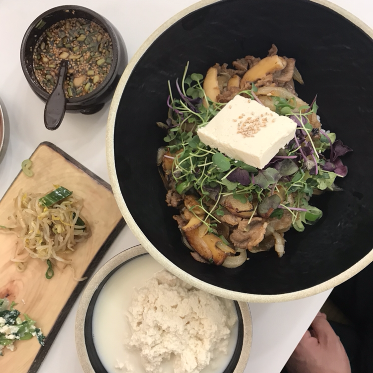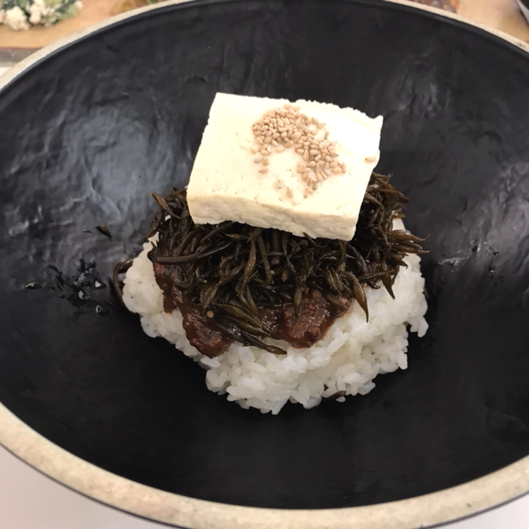 흔하지 않은 메뉴다. 밥 위에 강된장을 올리고 그 위해 양념한 톳 마지막으로 두부 토핑이 올라가 있다.