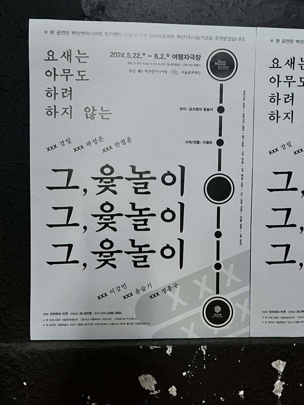 코너 스톤의 전작은 ’ 맹진사 댁 경사‘를 각색한 ’맹‘이었다. 이철희 연출은 다소 시간이 지난 그러나 그리 오래되지 않은 근현대 작품을 해석하는 능력이 탁월한 듯하다. 오세혁 연출이 이 연극을 꼭 보라고 추천해 현매로 보았다. 심지어 파격 할인된 가격으로.
