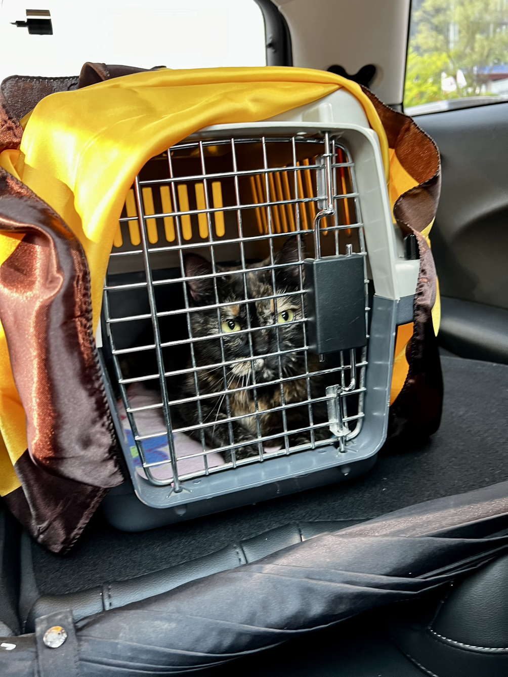 승용차 뒷좌석의 의자를 접어 평평하게 하고 순자의 캐이지 입구를 차 전면을 향하게 하였다. 순자는 우리 부부의 등을 보고 호기심 가득한 눈으로 관찰하다 졸다 부르면 대답하며 긴 여행을 마쳤다.