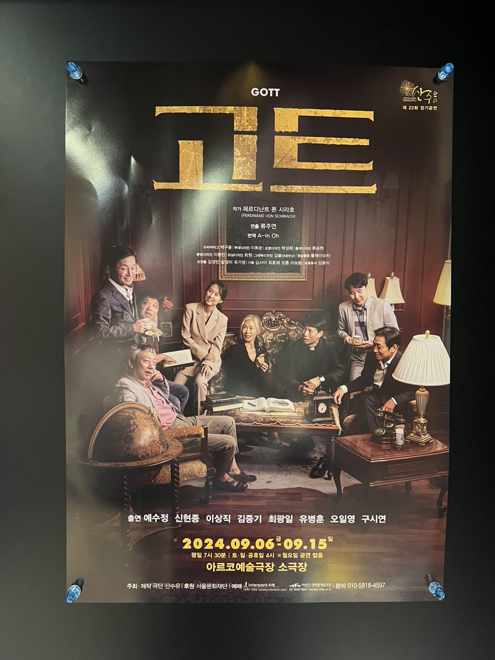 페르디난트 폰 시라흐 작, 류주연 연출, 극단 산수유 작품이다. 이 작품은 “(죽음을) 원하는 건강한 사람에 치명적인(죽음에 이를 수 있는) 약을 처방하는 것이 옳다고 생각하십니까?“라는 질문에 대한 토론이다.