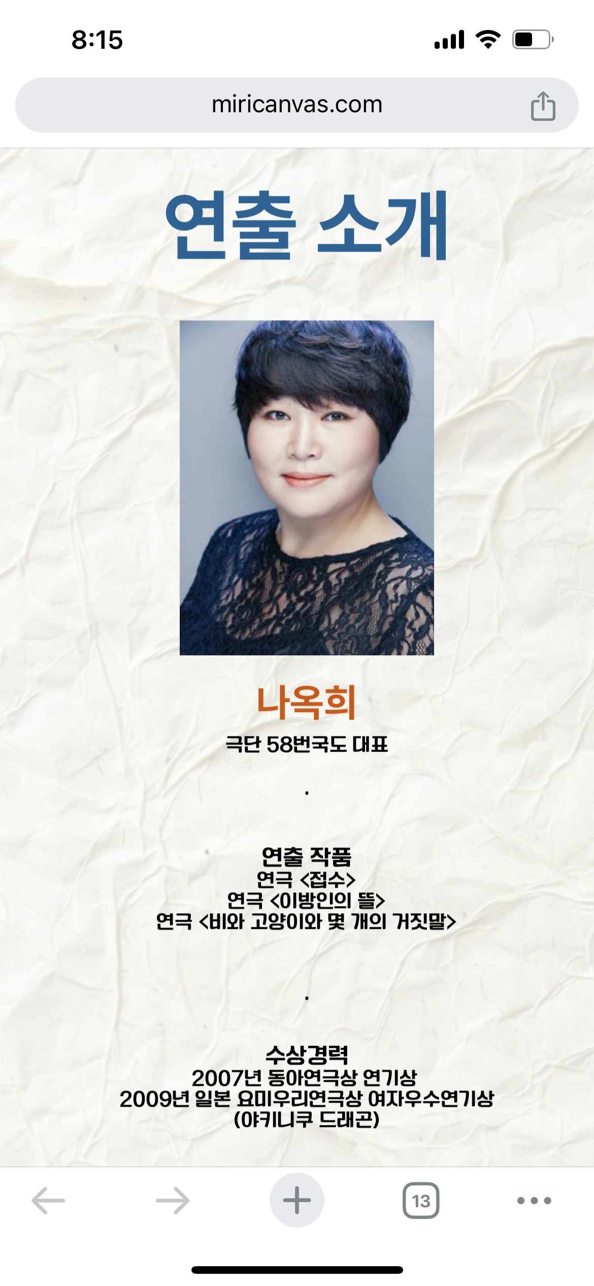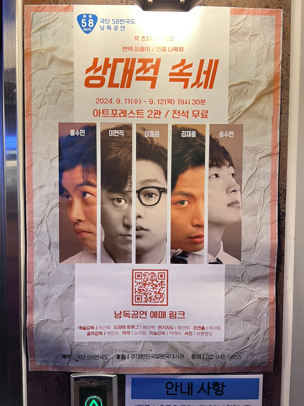 극단 58번 국도는 배우 고수희 씨가 ‘나옥희’라는 예명으로 연출과 번역을 하며 이끄는 극단이다. 극단의 전작 두 편을 보며 이 극단의 희곡 선정을 믿게 되었다. <상대적 속세>도 역시 작은 이야기로 큰 울림을 주는 작품이다.