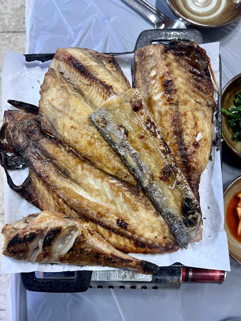 간단한 반찬과 부대찌개 그리고 5종의 생선구이다. 잘 구운 생선을 주물 팬에 올리고 이 팬을 가스버너 위에 올려서 먹는 내내 생선이 식지 않았다. 이게 생선구이를 맛있게 먹게 하는 비법 같았다.