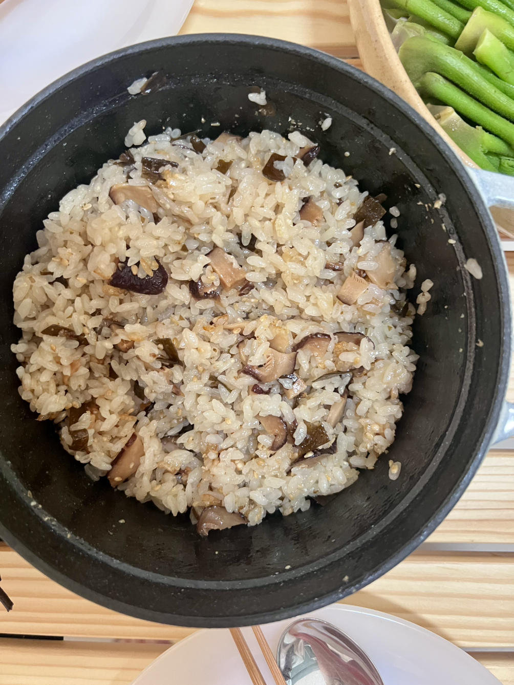 별 재료가 없으니 밥을 맛있게 지어야 한다. 표고와 다시마를 찬물에 불리고 그 물을 밥물로 썼다. 불린 표고와 다시마는 잘게 썰었다. 쌀과 다시마, 표고는 소금 살짝 넣고 들기름으로 살짝 볶다 밥물을 붓고 약간의 청주도 넣어 밥을 지었다. 밥이 잘 지어졌고 이 밥에 소금, 참기름, 깨소금을 넣어 비벼서 준비한다. 김밥의 핵심은 간이 맞는 맛있는 밥이다.