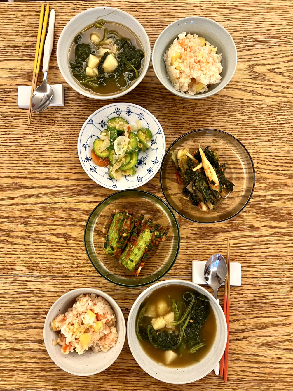 아욱 감잣국, 토마토 감자밥, 오이소박이, 애호박볶음, 열무김치.