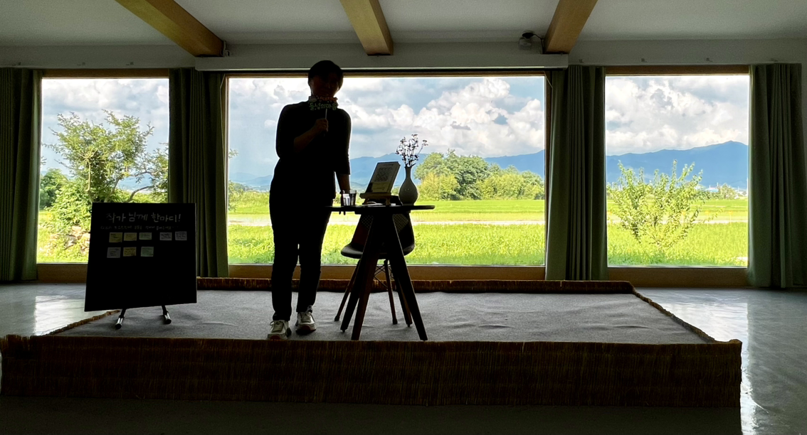 북토크엔 100여 분이 참가했다. 오지 곡성까지 정혜신 선생의 치유의 이야기를 듣고자 온 것이다. 낯익은 분들도 계셨고 우리 부부에게 인사를 해주신 분도 계셔서 다소 쑥스러웠다. 북토크가 열린 발채의 마음 무대 뒤엔 암막 커튼이 쳐져 있었는데 정혜신 선생께서 커튼을 열자 하셨고 커튼이 열리자 탄성이 쏟아졌다. 논과 산과 하늘이 만들어낸 풍경이 절경이었다.